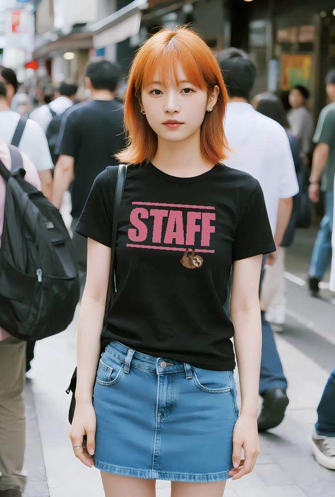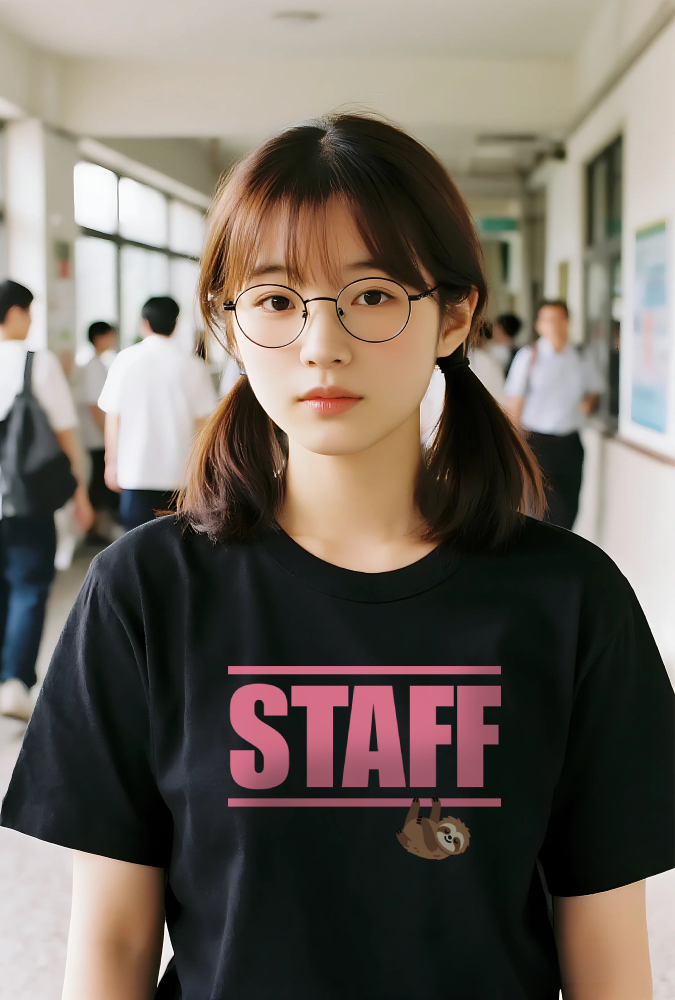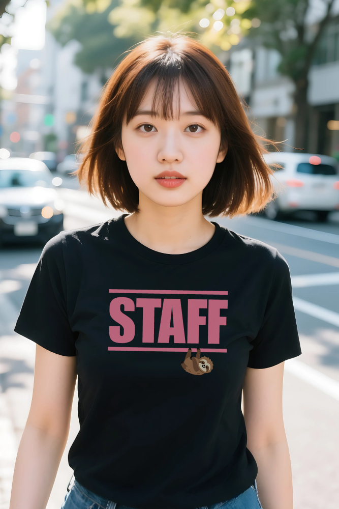 ユニークで目を引く「STAFF」Tシャツが登場!忙しい毎日にちょっとした癒しを届ける、キュートなナマケモノのイラストが特徴です。