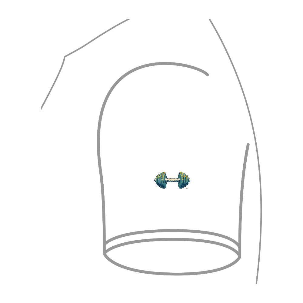 かすれたような暗めのターコイズブルーの文字と、左袖にいるダンベルがより筋トレ感を演出