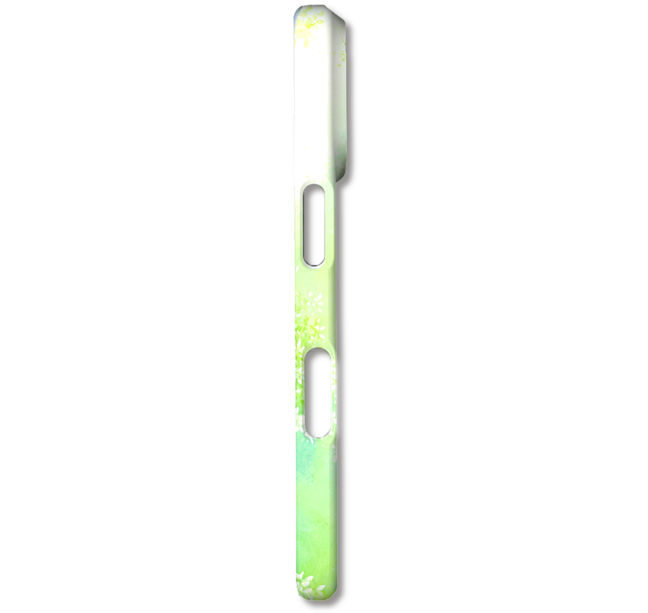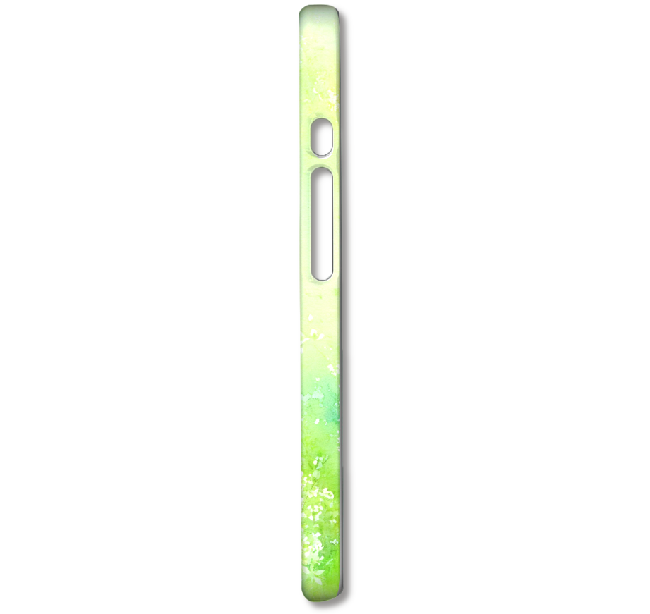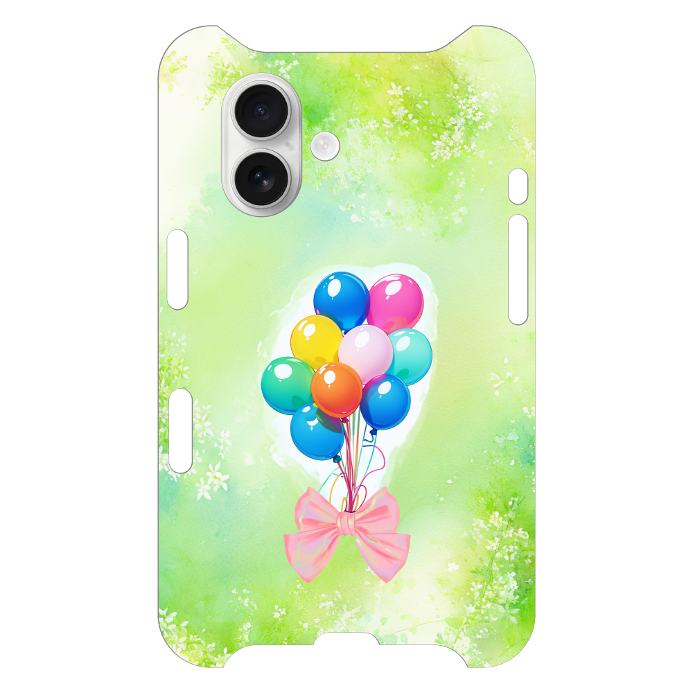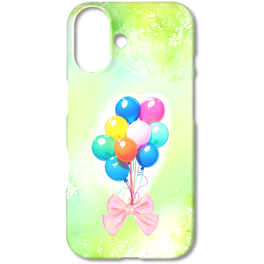 このスマホケースは、ふんわりとした水彩画のような背景に、色とりどりの風船が浮かぶ、遊び心あふれるデザインです。背景の柔らかなグリーンは、まるで光が降り注ぐ森の中にいるかのような安らぎを与え、可愛らしい白い小花が可憐に咲いています。