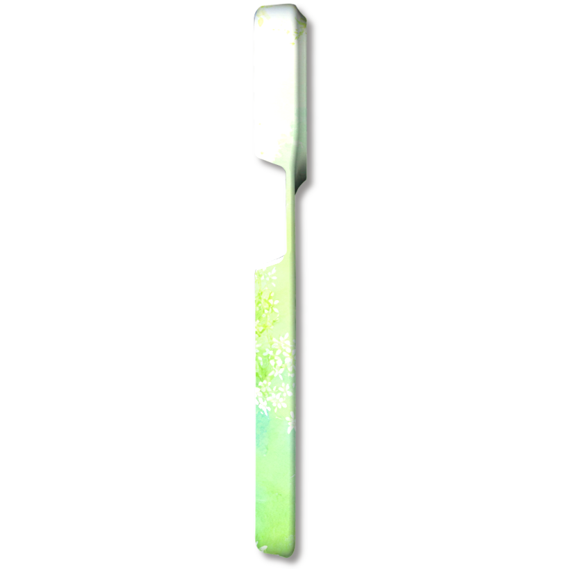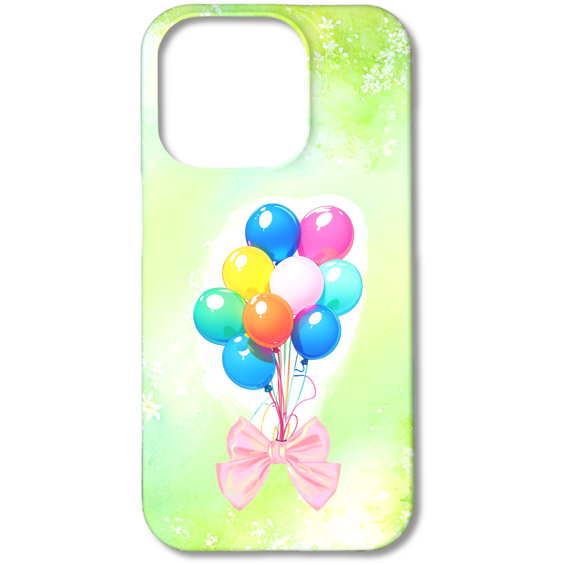 このスマホケースは、ふんわりとした水彩画のような背景に、色とりどりの風船が浮かぶ、遊び心あふれるデザインです。背景の柔らかなグリーンは、まるで光が降り注ぐ森の中にいるかのような安らぎを与え、可愛らしい白い小花が可憐に咲いています。