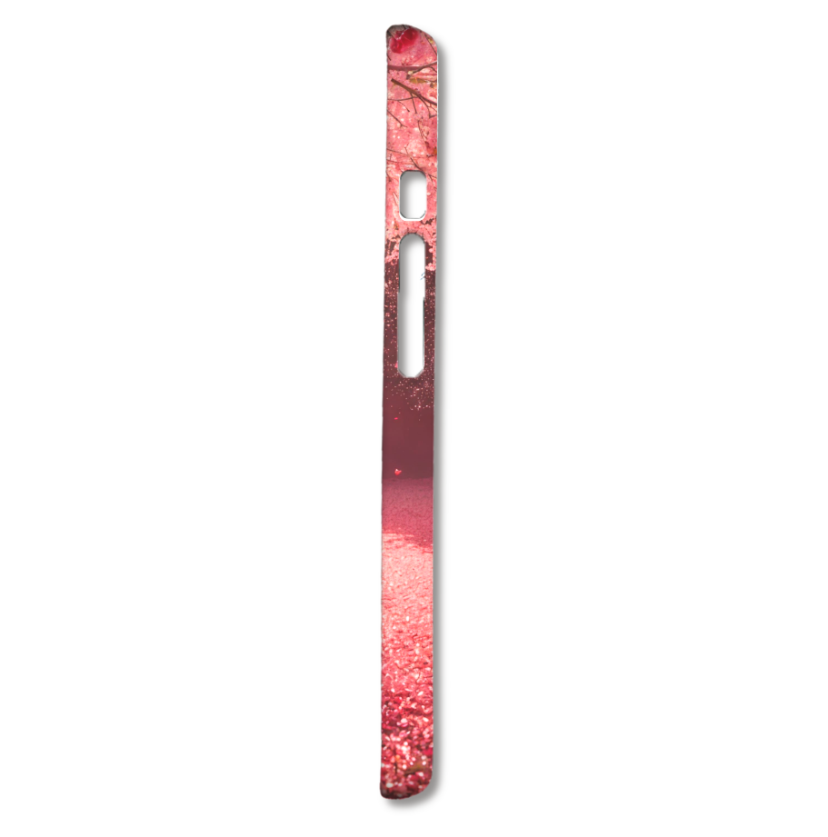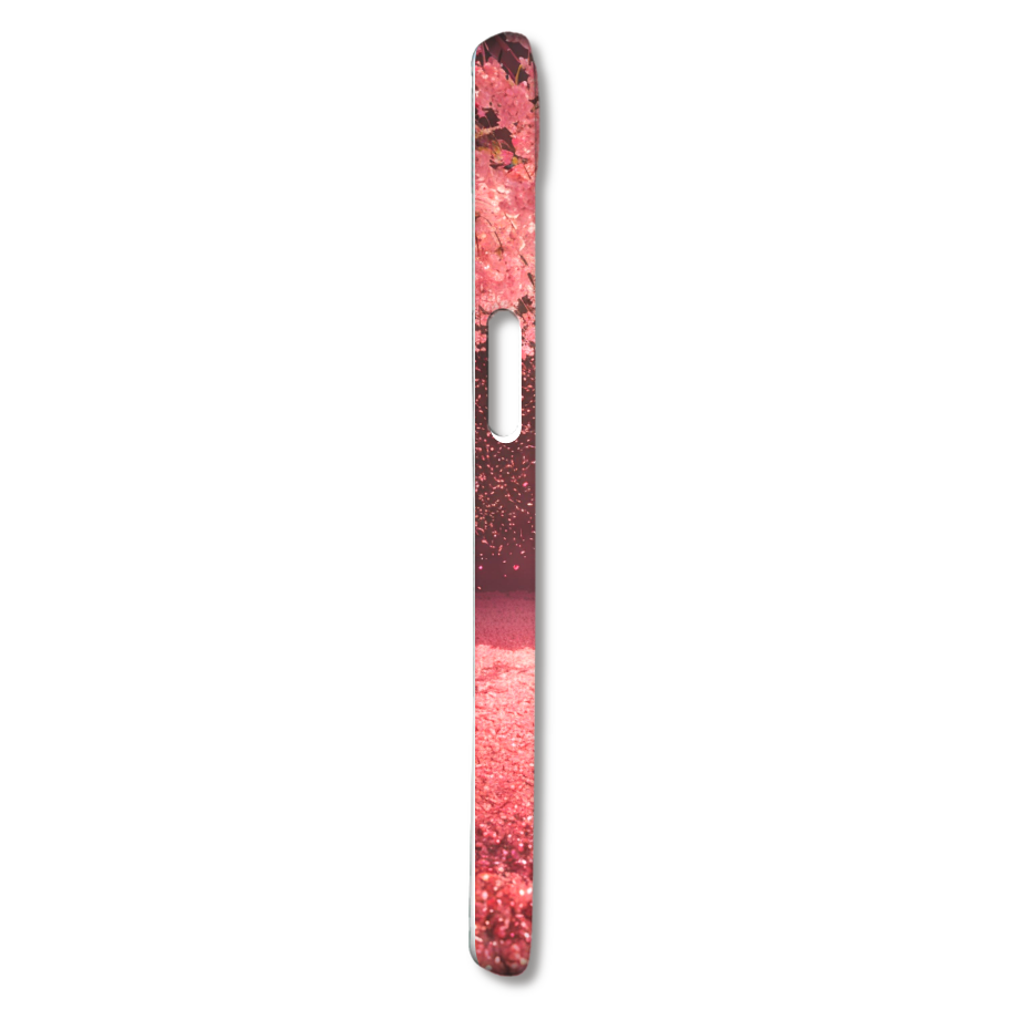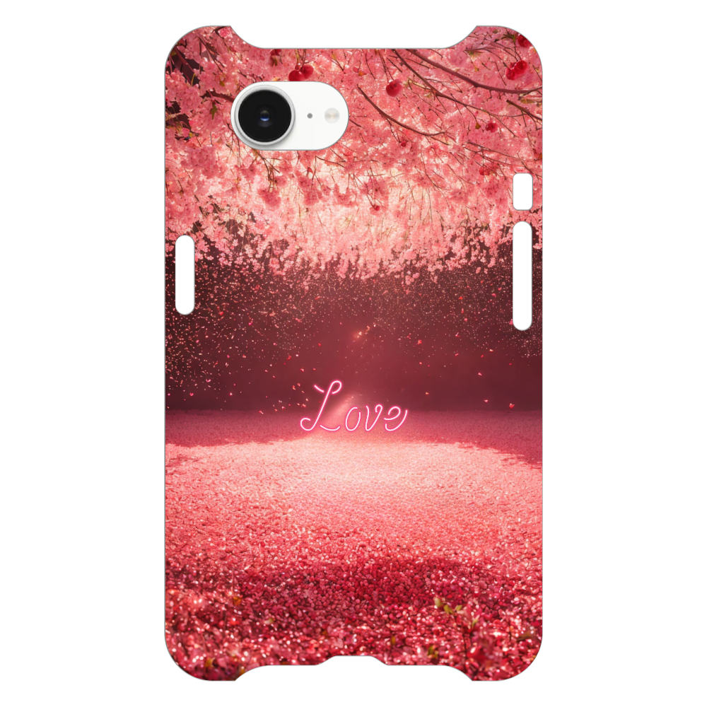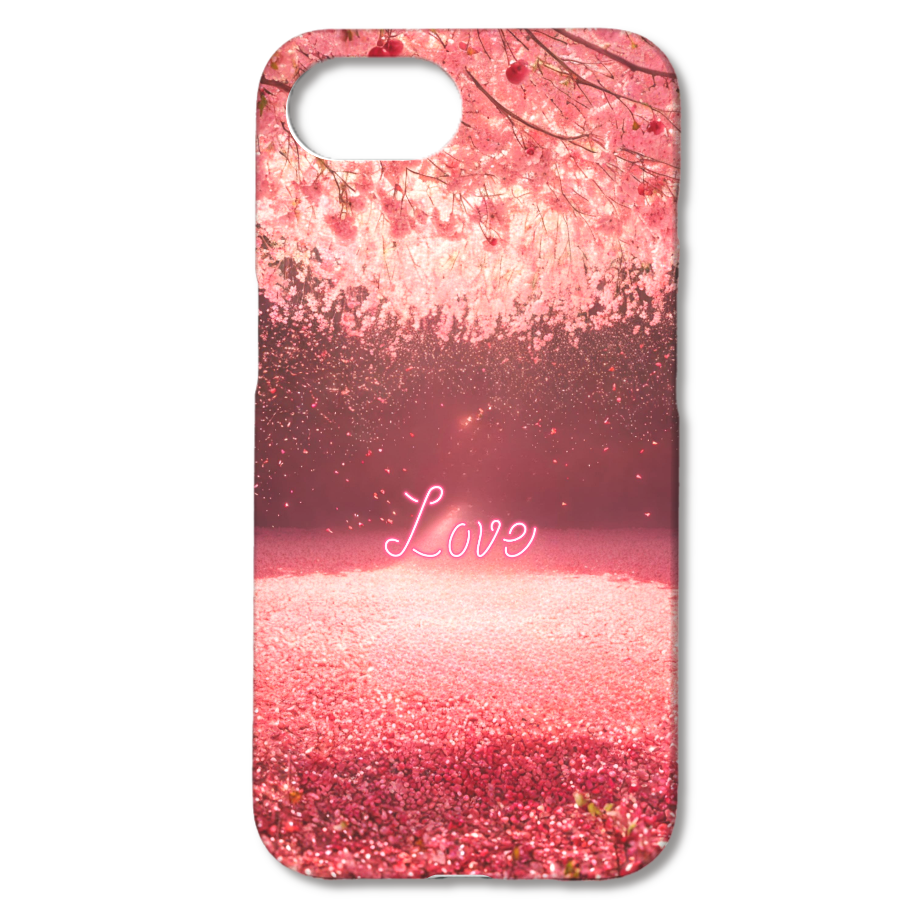 このスマホケースは、満開の桜と、まるで雨のように降り注ぐ桜の花びらが織りなす幻想的な世界をデザインしました。無数の花びらが舞い散る様子は、ロマンチックな愛の雨を表現しています。中央にはネオンピンクの「Love」の文字が光り、この美しい景色に愛のメッセージを添えています。