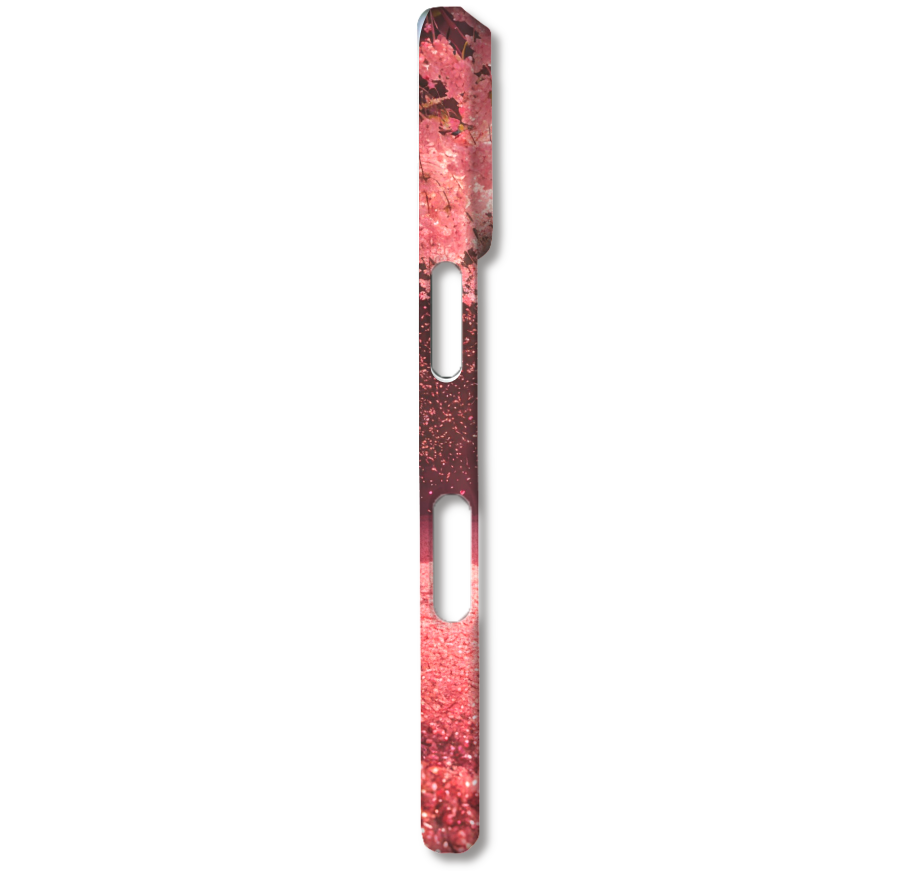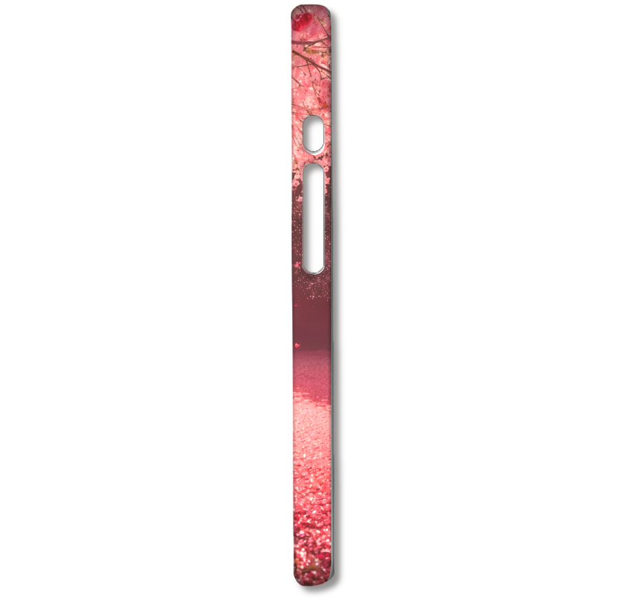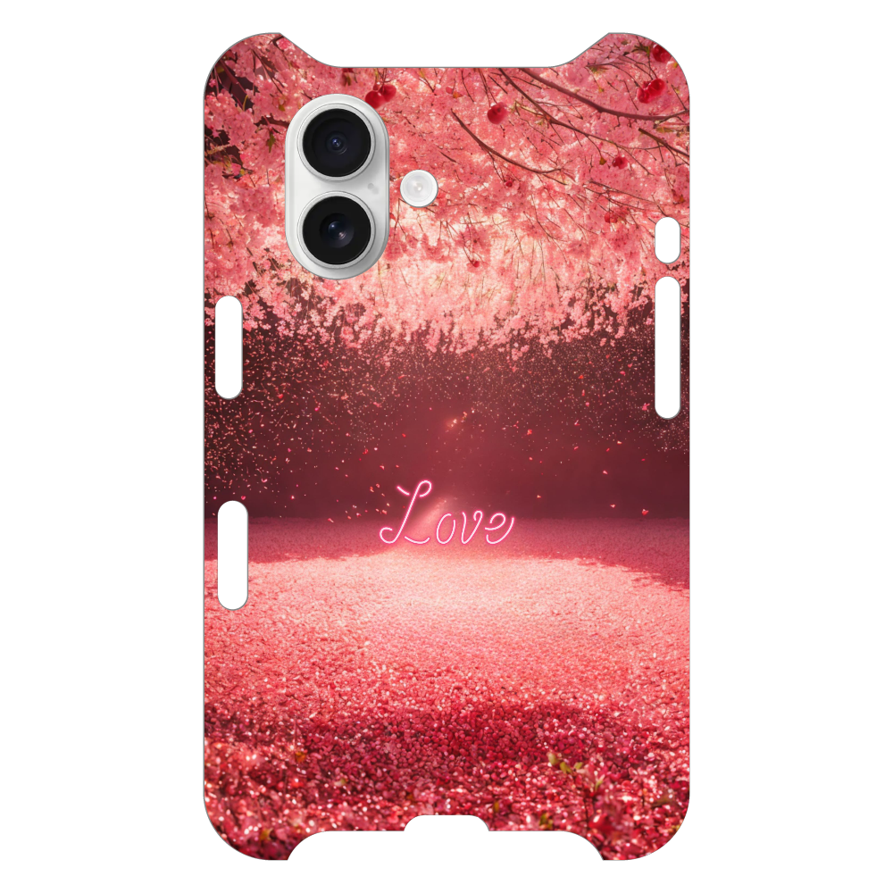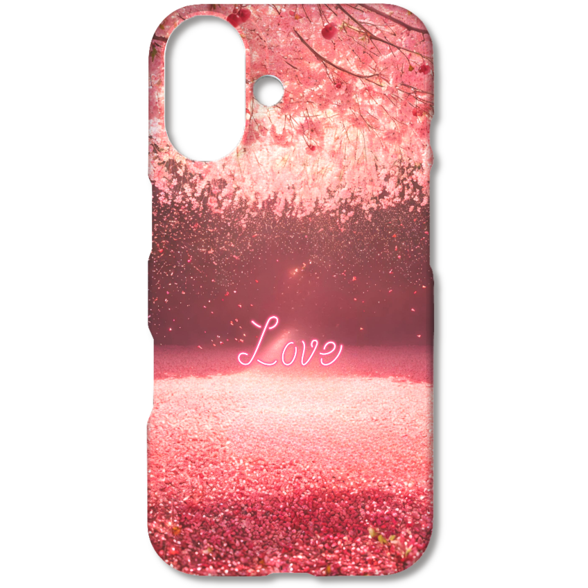 このスマホケースは、満開の桜と、まるで雨のように降り注ぐ桜の花びらが織りなす幻想的な世界をデザインしました。無数の花びらが舞い散る様子は、ロマンチックな愛の雨を表現しています。中央にはネオンピンクの「Love」の文字が光り、この美しい景色に愛のメッセージを添えています。
