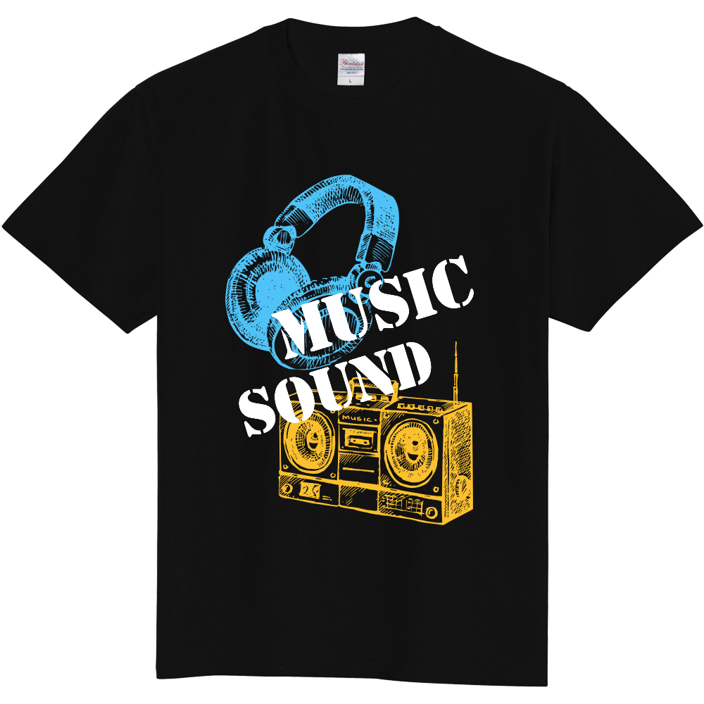 「 MUSIC SOUND」の文字とレトロなヘッドホンとラジカセをポップにデザインしたカッコイイTシャツ