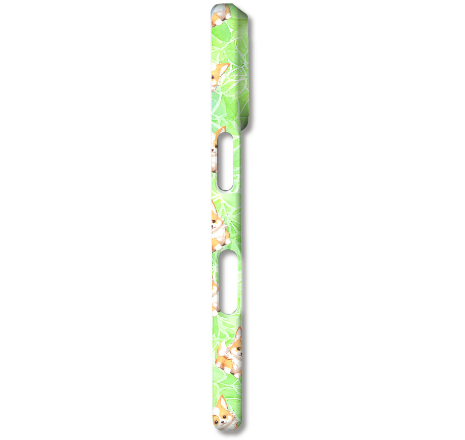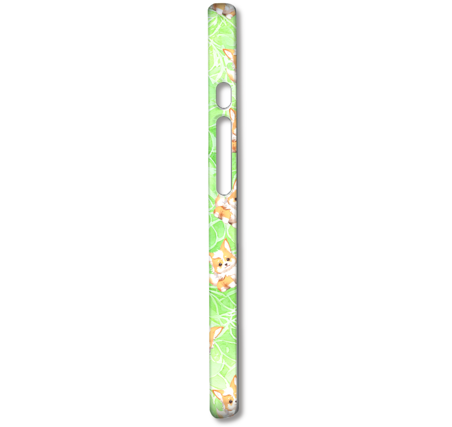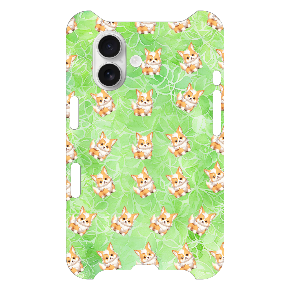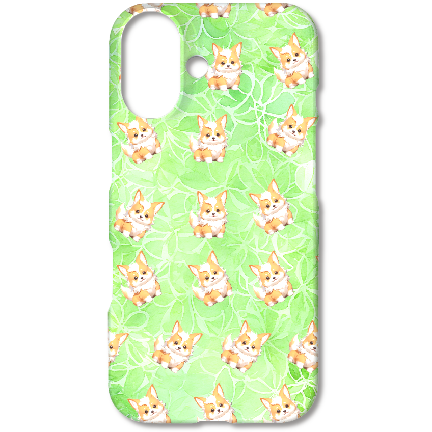 愛らしいコーギーの子犬たちが緑豊かな葉っぱの中で遊んでいる、心温まるスマートフォンケースです。