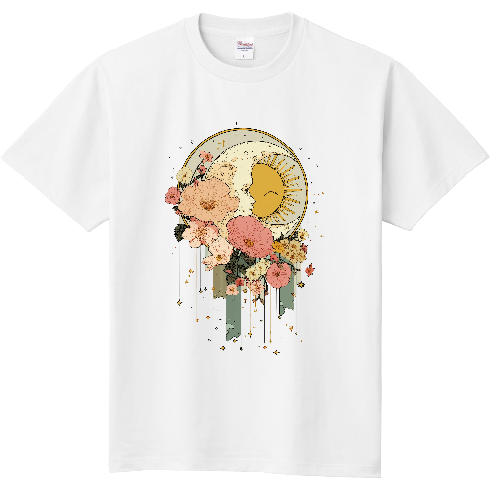 神秘的な月と太陽が寄り添い、美しい花々が咲き誇る、ロマンティックなデザインのTシャツです。