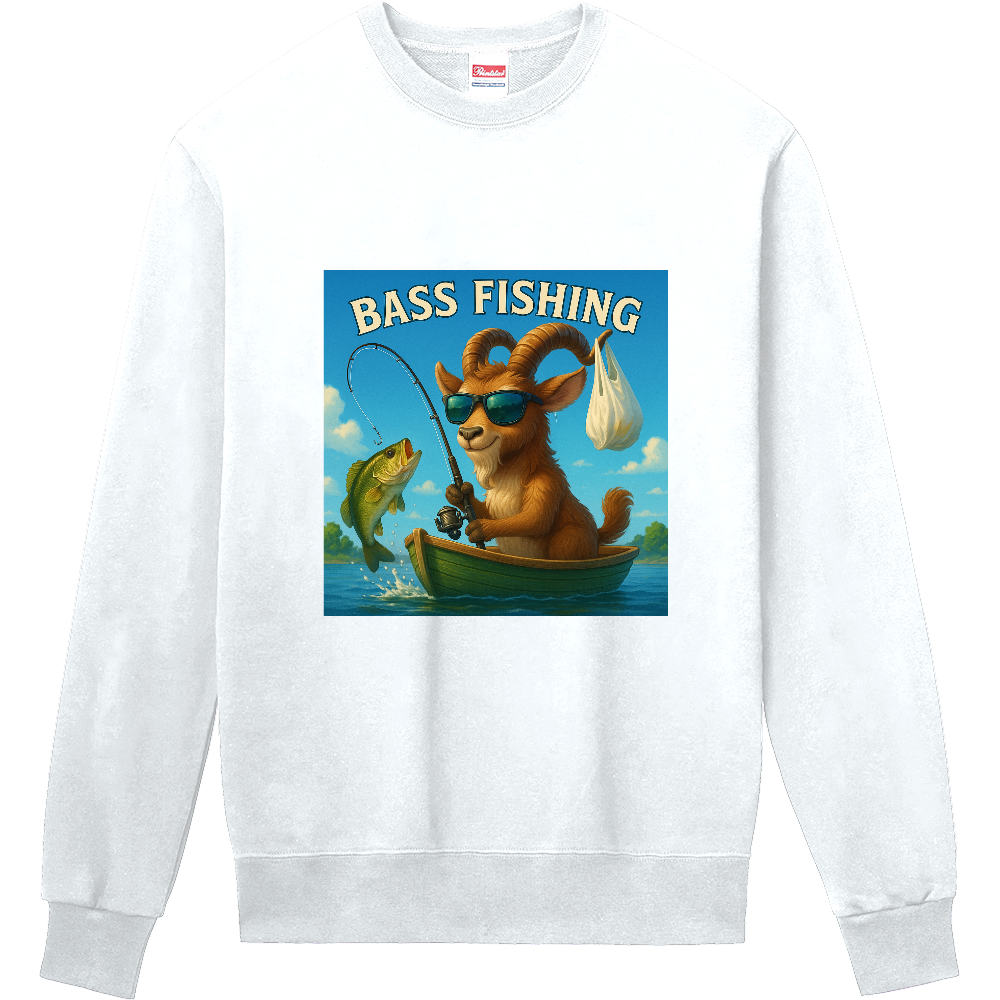 大きなサングラスをかけた山羊が、ブラックバス釣りを楽しむユニークなイラストをデザインしたTシャツです。 右のツノにはコンビニ袋をぶら下げ、湖上で余裕のフィッシングスタイルを披露。 遊び心とアウトドア感が融合した、他にはない個性的なデザインです。