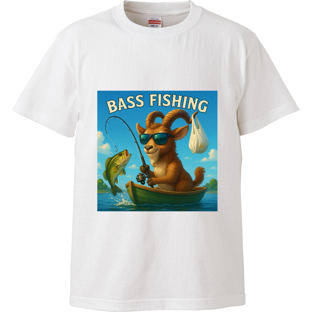 大きなサングラスをかけた山羊が、ブラックバス釣りを楽しむユニークなイラストをデザインしたTシャツです。 右のツノにはコンビニ袋をぶら下げ、湖上で余裕のフィッシングスタイルを披露。 遊び心とアウトドア感が融合した、他にはない個性的なデザインです。