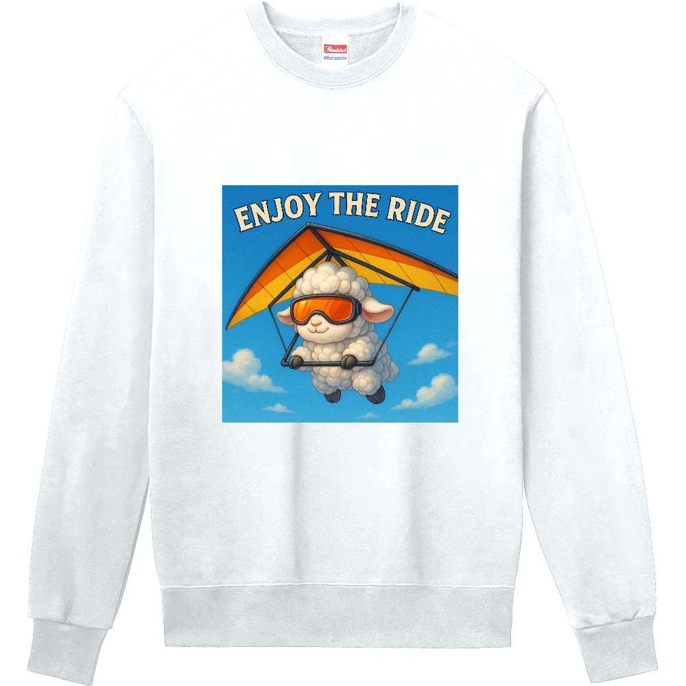 ふわふわの羊がオレンジのゴーグルをかけて、青空の下をハンググライダーで駆け抜けるポップでユニークなデザイン。