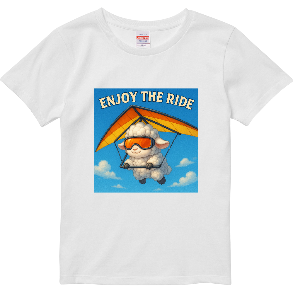 ふわふわの羊がオレンジのゴーグルをかけて、青空の下をハンググライダーで駆け抜けるポップでユニークなデザイン。