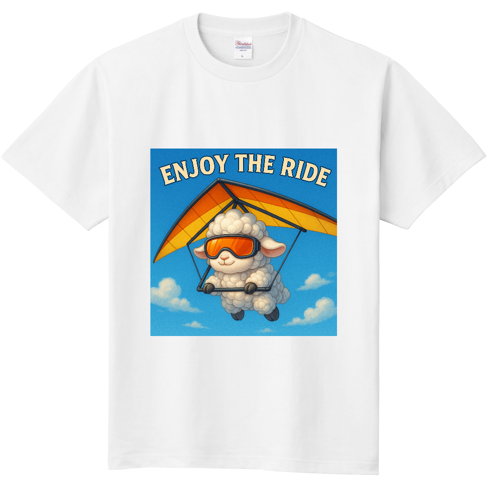 ふわふわの羊がオレンジのゴーグルをかけて、青空の下をハンググライダーで駆け抜けるポップでユニークなデザイン。