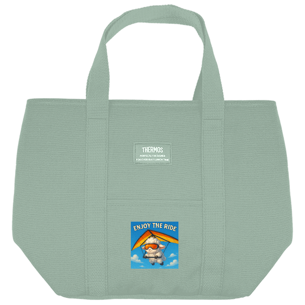 ふわふわの羊がオレンジのゴーグルをかけて、青空の下をハンググライダーで駆け抜けるポップでユニークなデザイン。