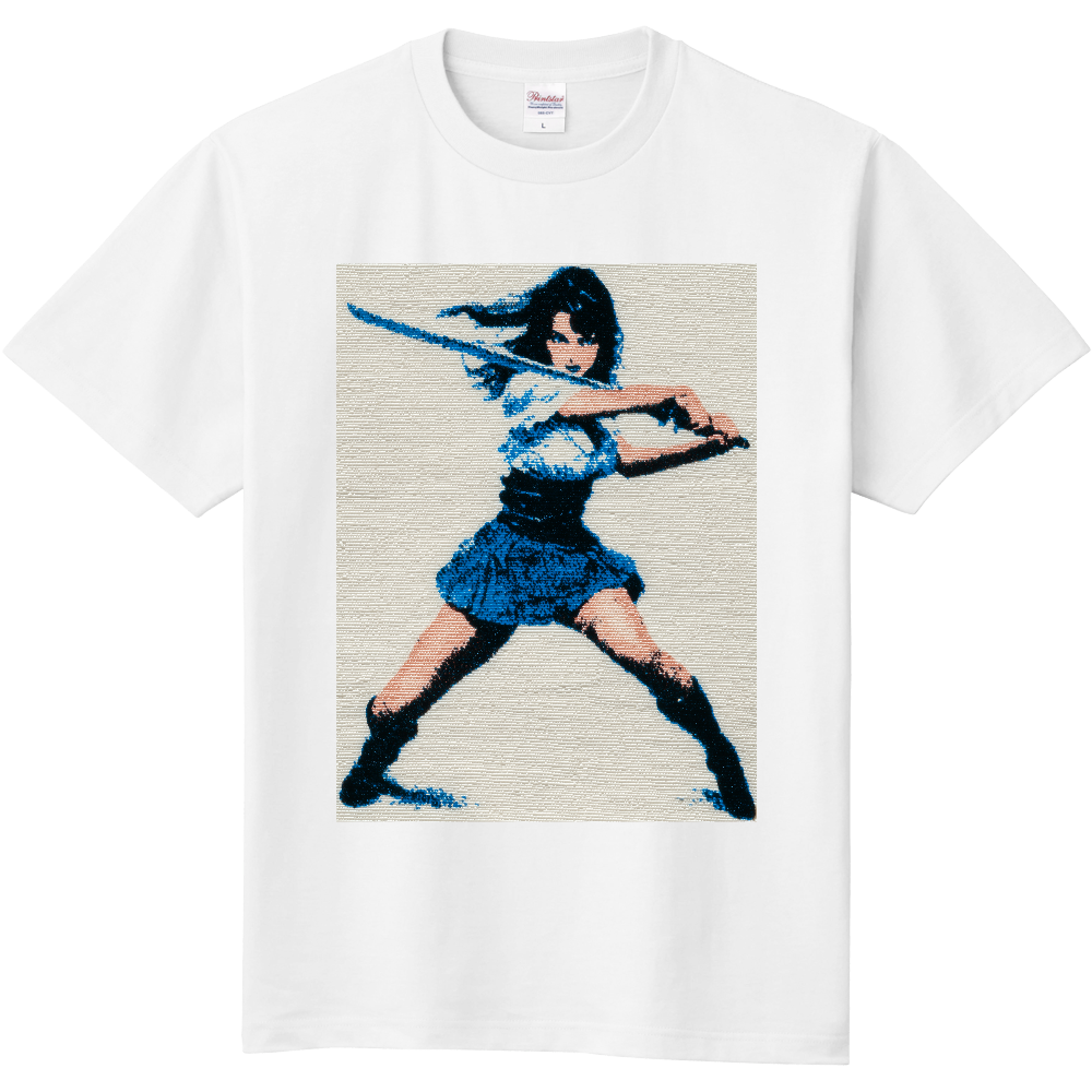 背景の浮世絵風の質感と、現代的なTシャツの素材が組み合わさることで、和と洋、古と新が融合したデザインに仕上がっています。