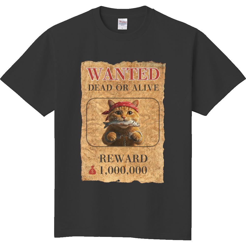 魚を盗み、バンダナを巻き、ついには手錠をかけられた伝説のアウトロー!指名手配書にはデカデカと「WANTED」「DEAD OR ALIVE」!そして賞金額はなんと――100万ドル!!着るだけであなたも立派な賞金稼ぎだ!さあ、この“危険すぎるお魚ハンター”を、あなたの胸に掲げよう!