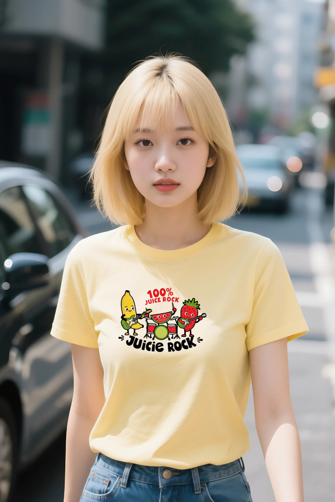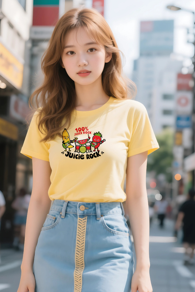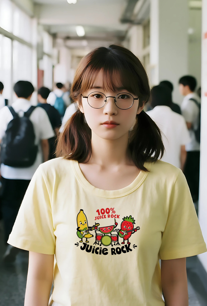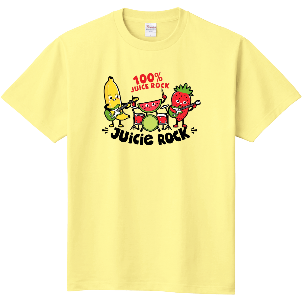 【100% JUICE ROCK】バナナ・スイカ・イチゴのロックバンドTシャツ|可愛いフルーツキャラクター×音楽デザイン