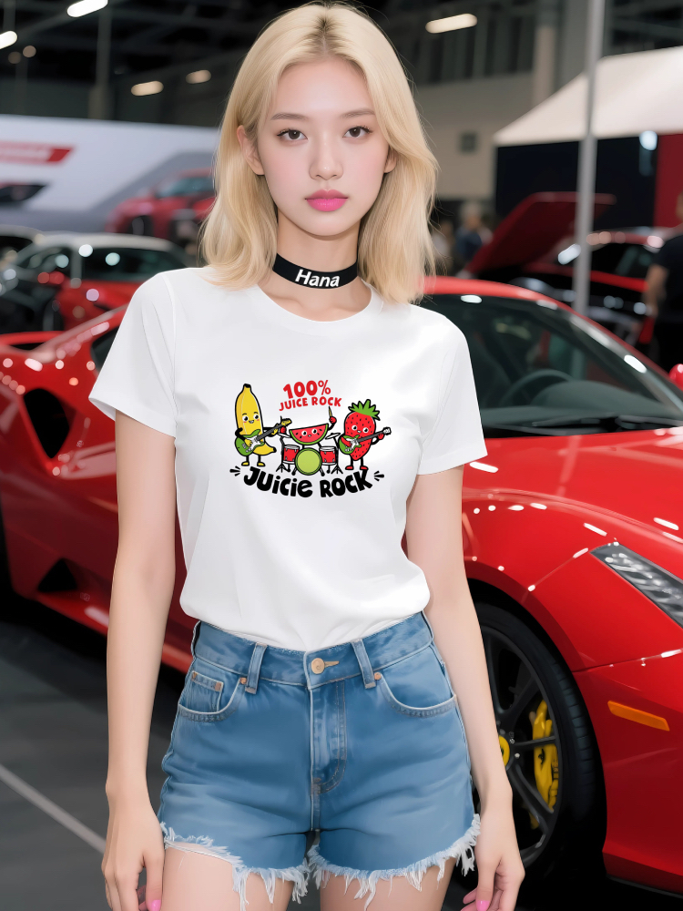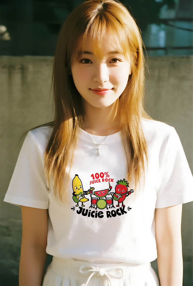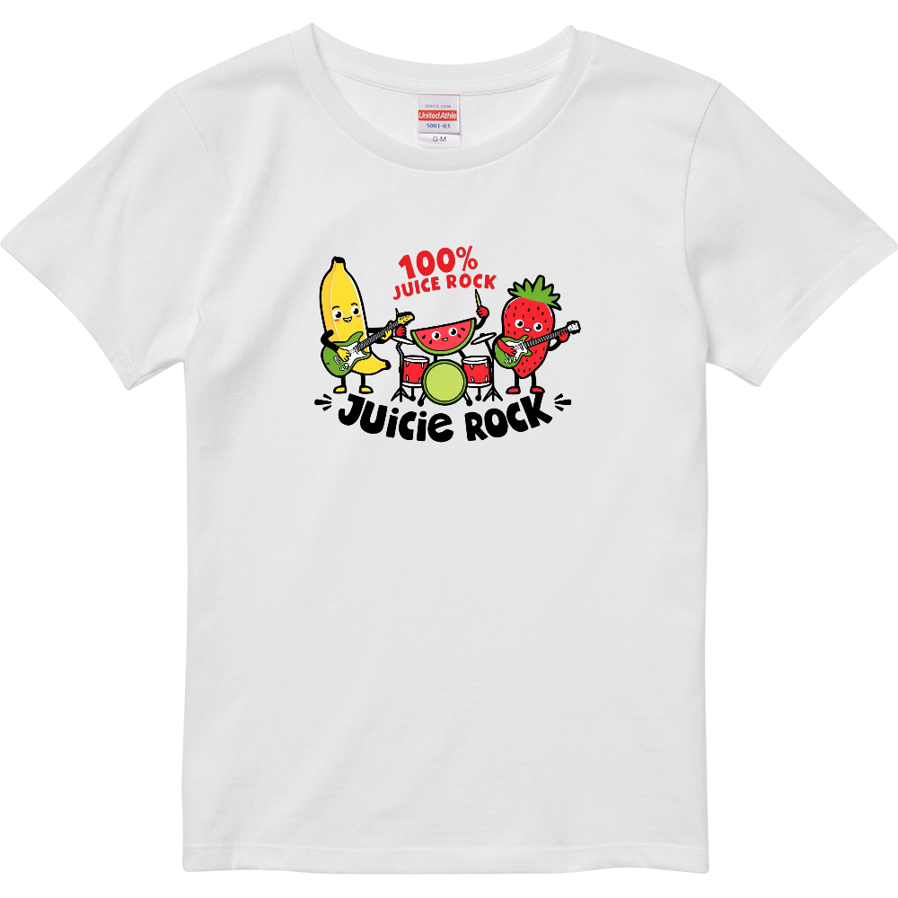 【100% JUICE ROCK】バナナ・スイカ・イチゴのロックバンドTシャツ|可愛いフルーツキャラクター×音楽デザイン
