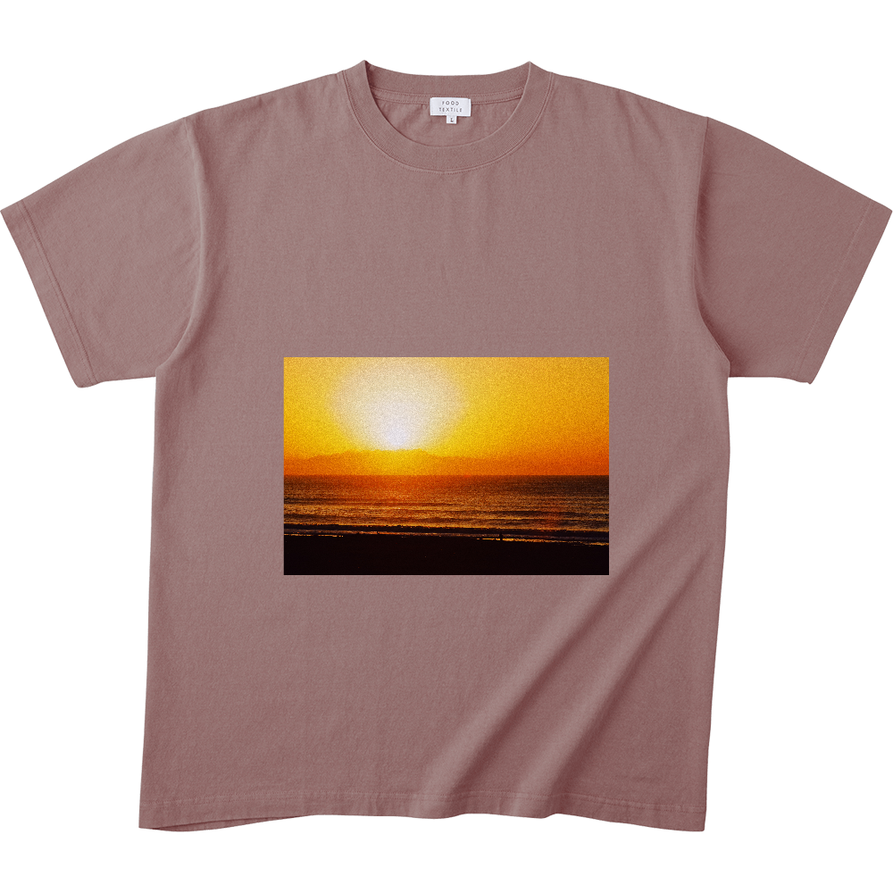 • ブルーベリー染め: 廃棄されるブルーベリーをアップサイクルし、染料として使用しています。深みがありながらも、どこかやさしい印象を与えるブルーベリーの色合いが、Tシャツに自然な風合いと奥行きを与えています。このTシャツにプリントされているのは、夕焼けに染まる海の雄大な風景です。ブルーベリーの落ち着いた色合いのボディに、燃えるような夕日が映え、静けさの中にも力強さを感じるデザインとなっています。