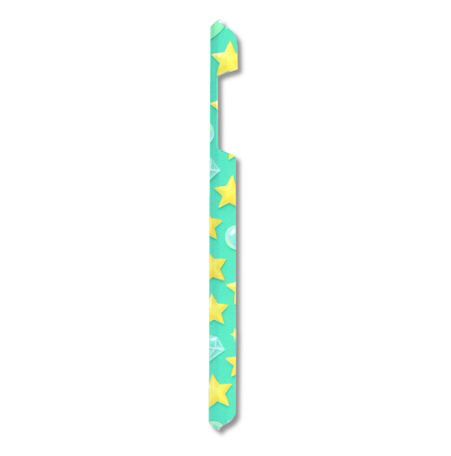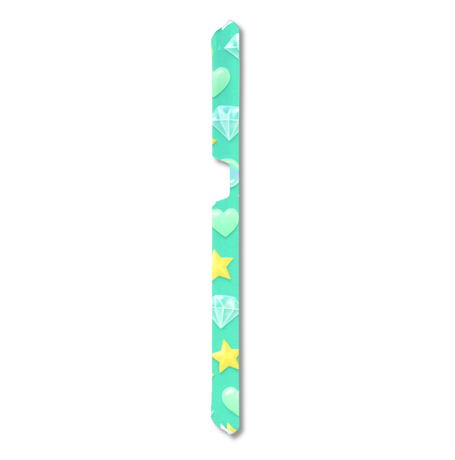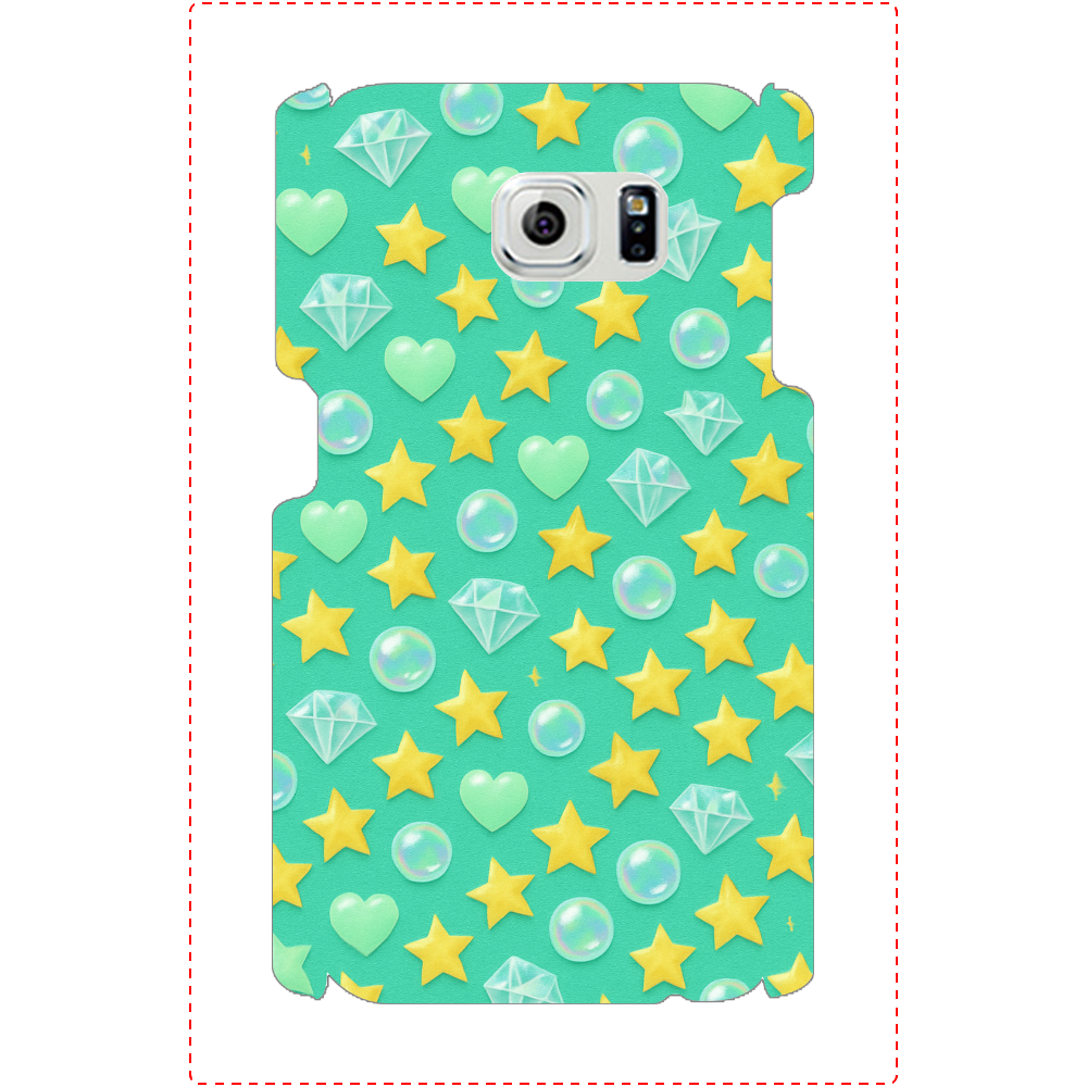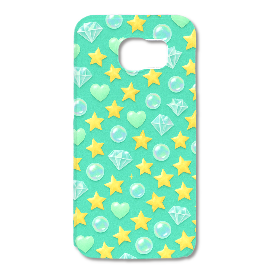きらめくシルバーダイヤ、可愛らしいハート、輝く星、そして幻想的なシャボン玉がエメラルドグリーンの背景に散りばめられた華やかなデザイン。