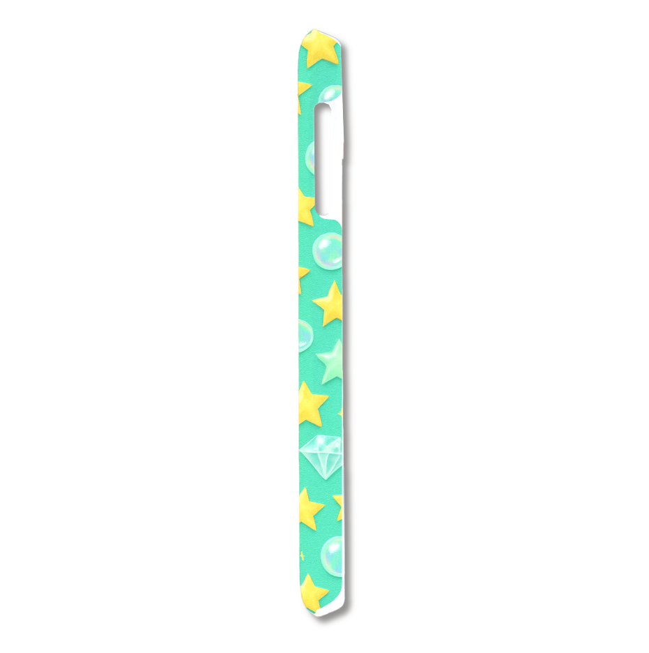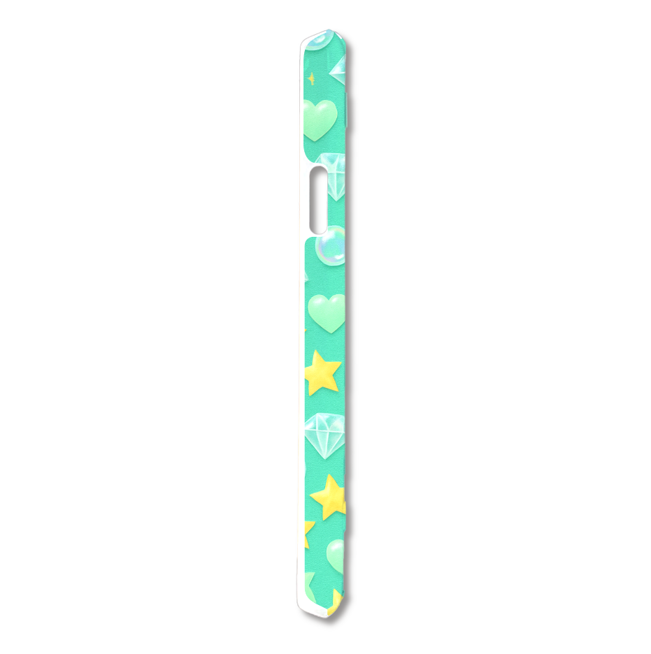 きらめくシルバーダイヤ、可愛らしいハート、輝く星、そして幻想的なシャボン玉がエメラルドグリーンの背景に散りばめられた華やかなデザイン。