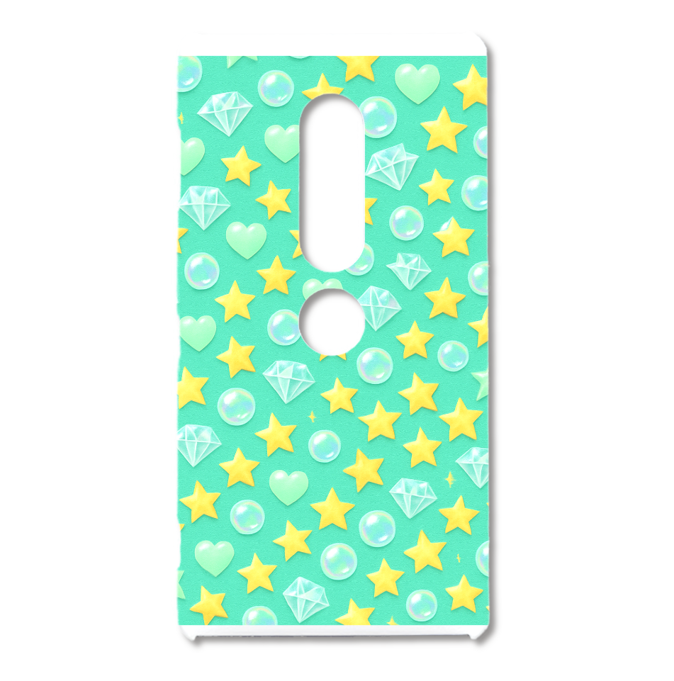 きらめくシルバーダイヤ、可愛らしいハート、輝く星、そして幻想的なシャボン玉がエメラルドグリーンの背景に散りばめられた華やかなデザイン。