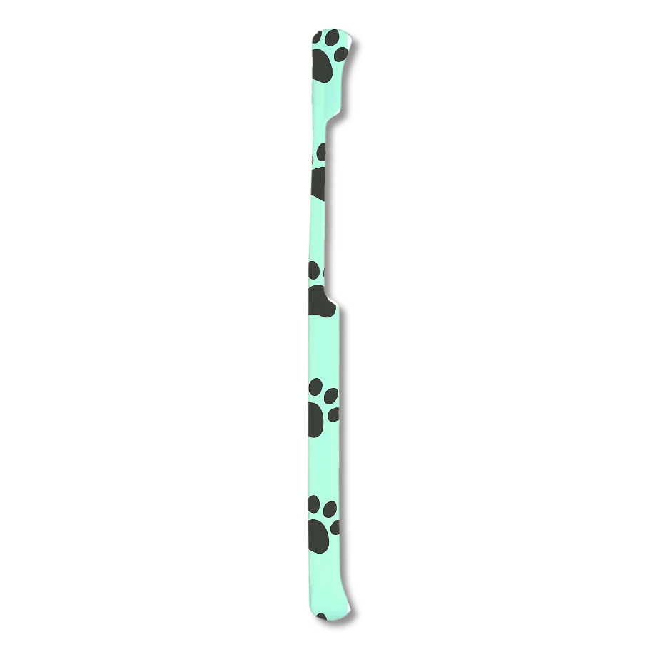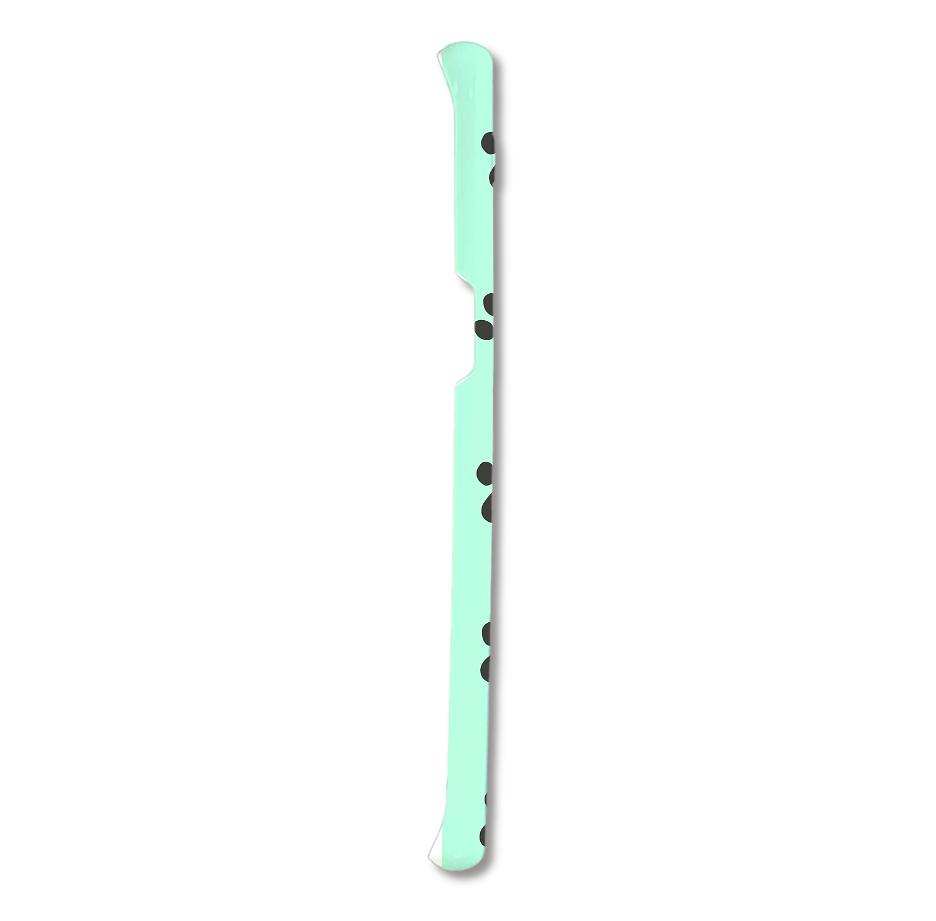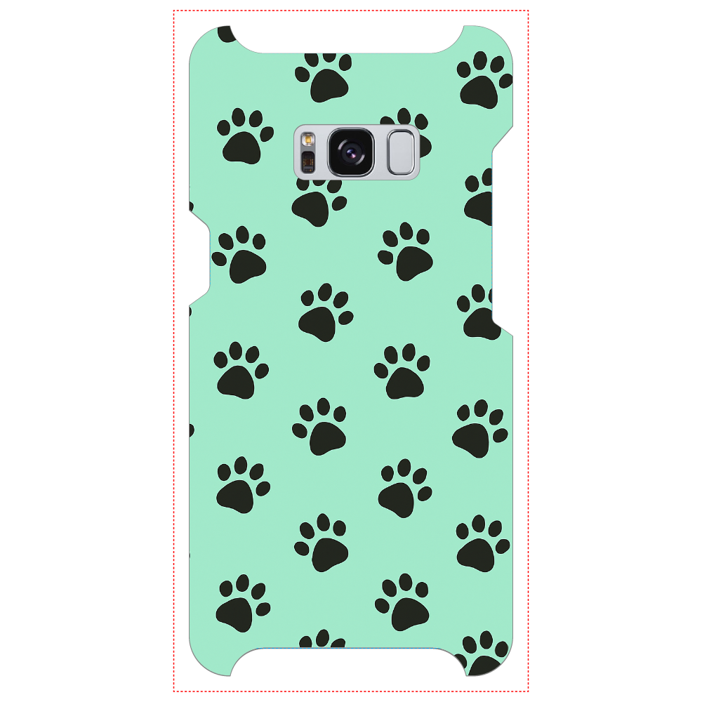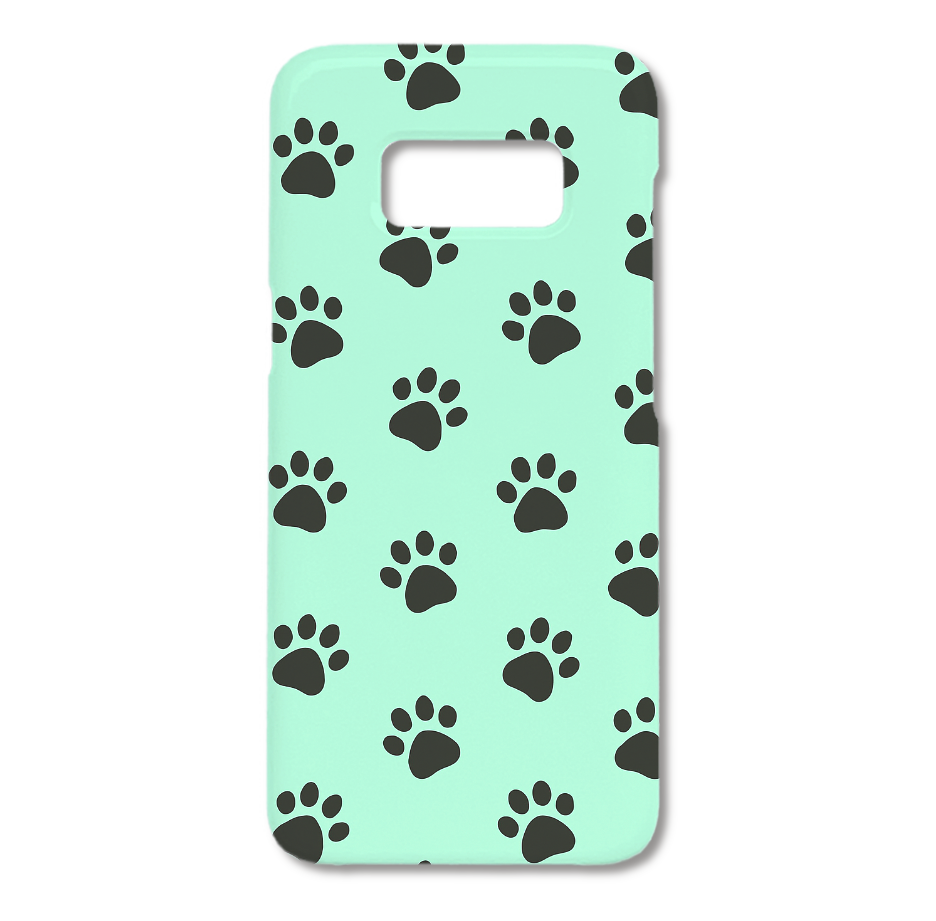 エメラルドグリーンの背景に黒い肉球模様を散りばめた、キュートで癒し感たっぷりのスマホケース。