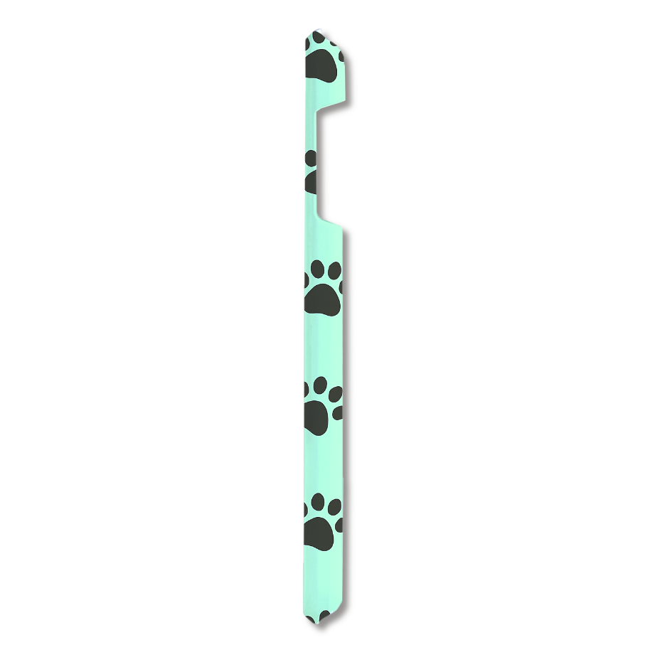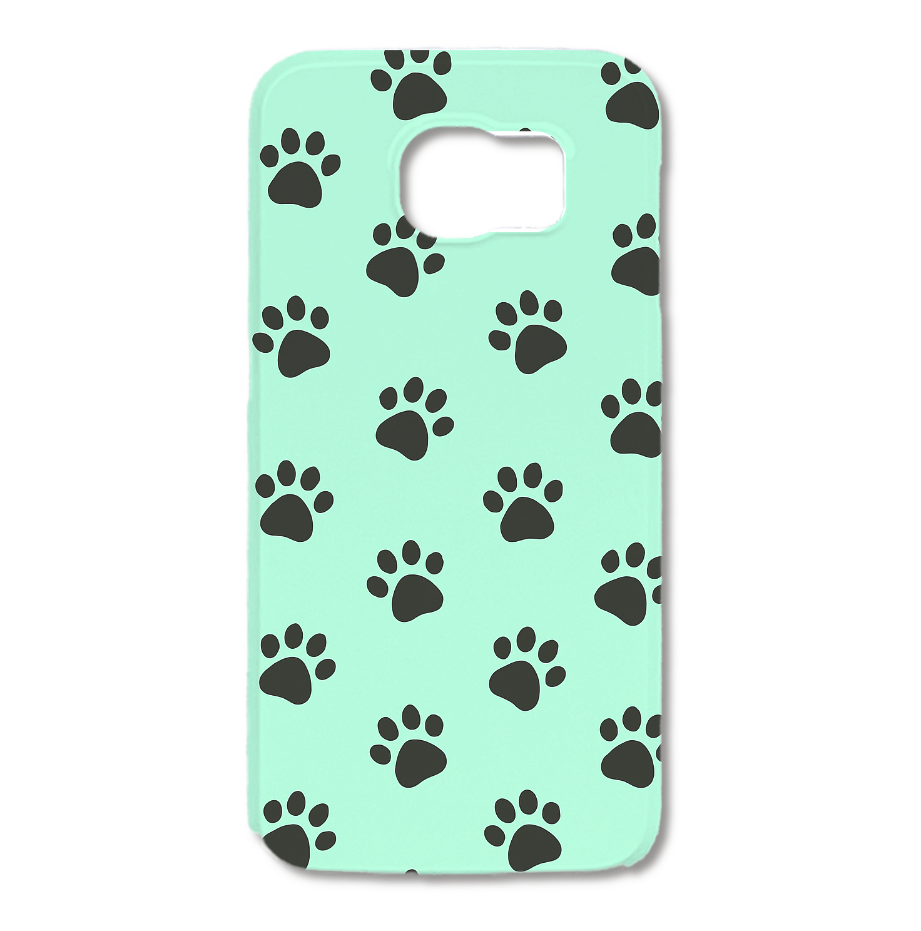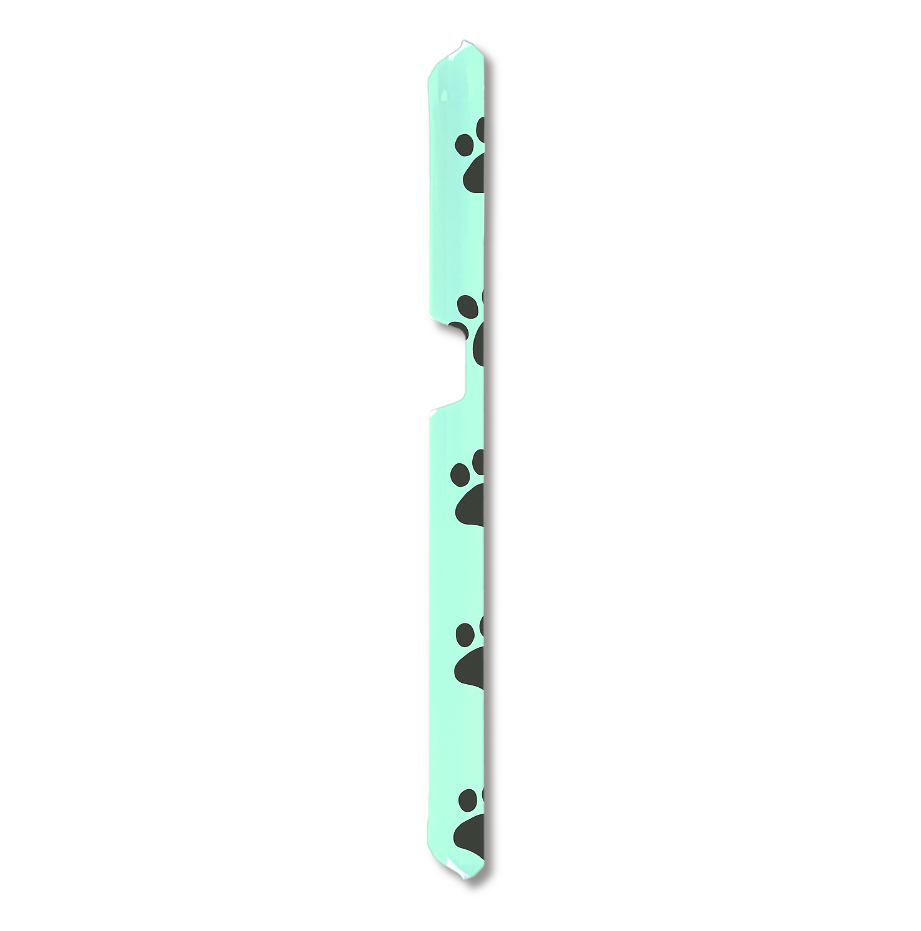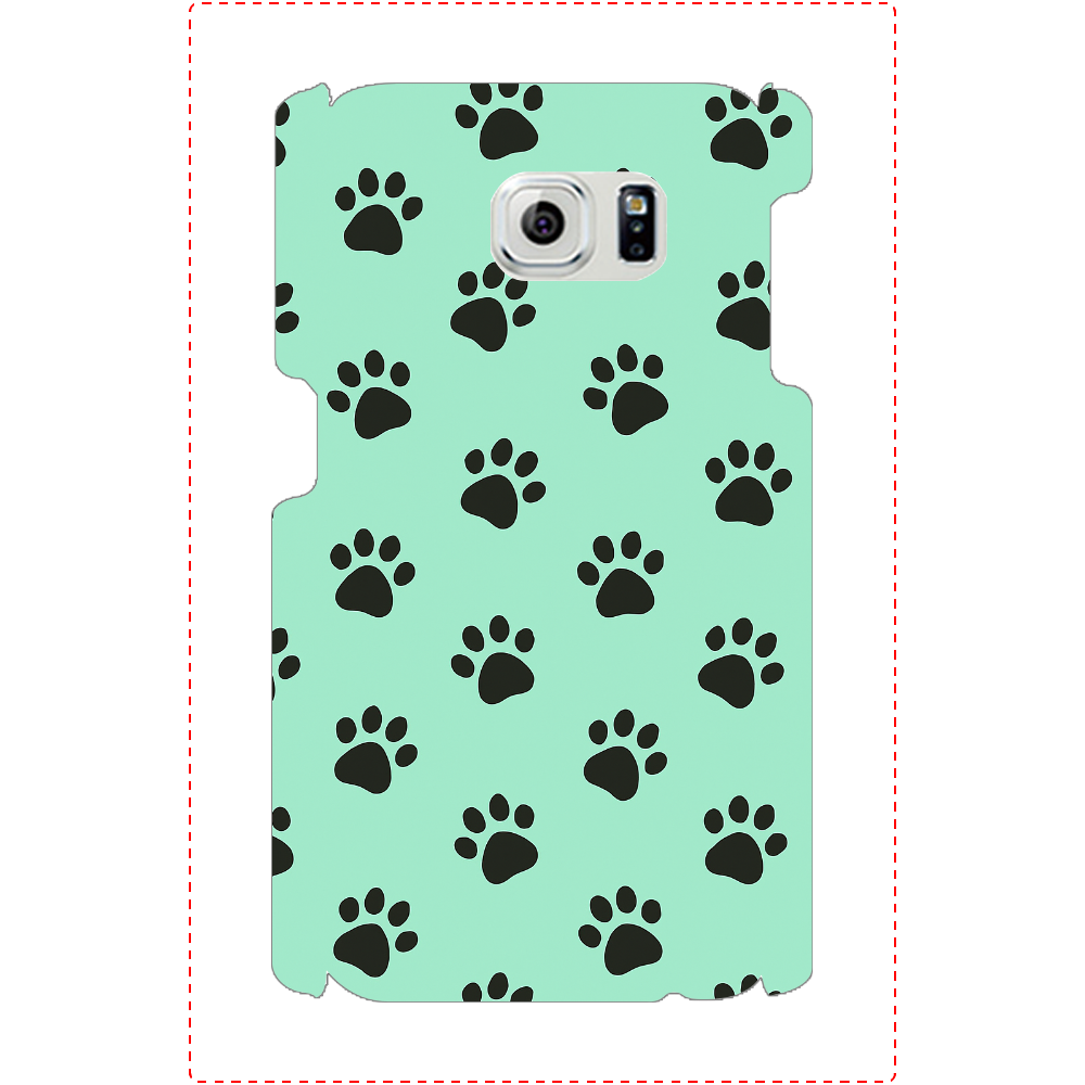 エメラルドグリーンの背景に黒い肉球模様を散りばめた、キュートで癒し感たっぷりのスマホケース。