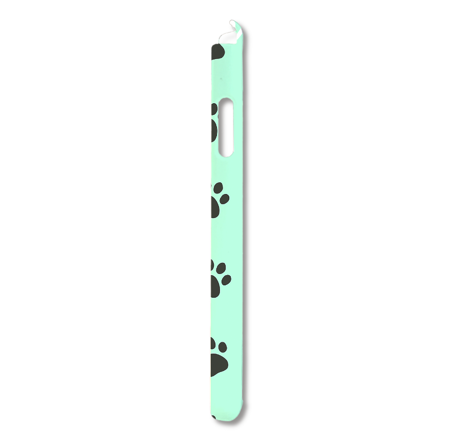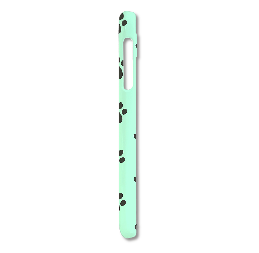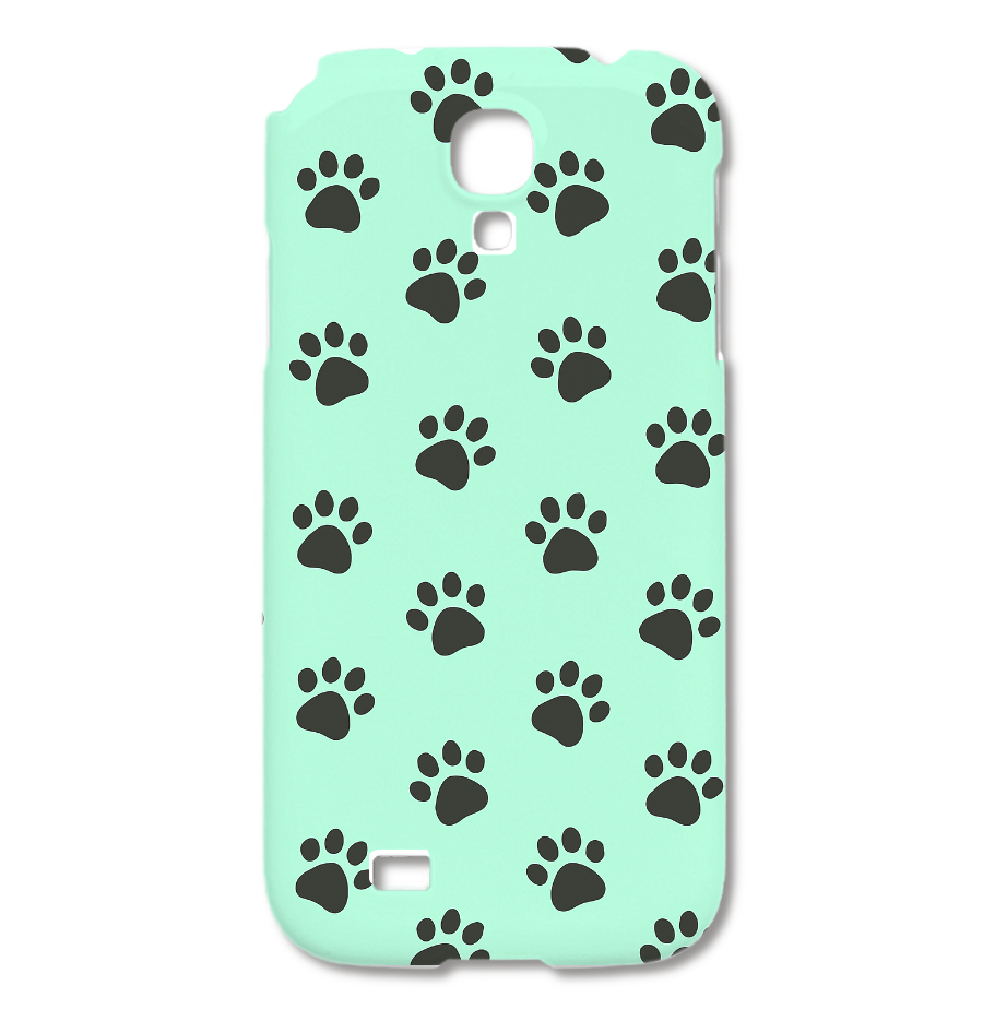 エメラルドグリーンの背景に黒い肉球模様を散りばめた、キュートで癒し感たっぷりのスマホケース。