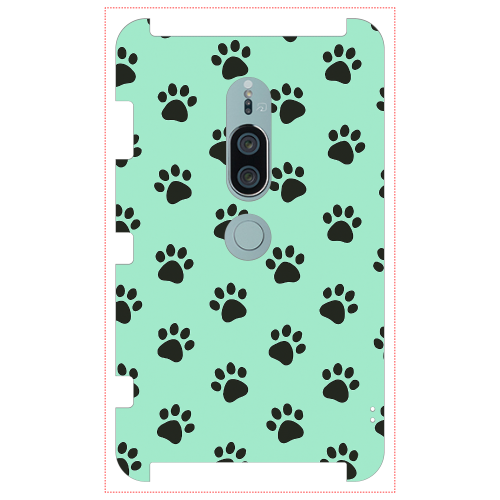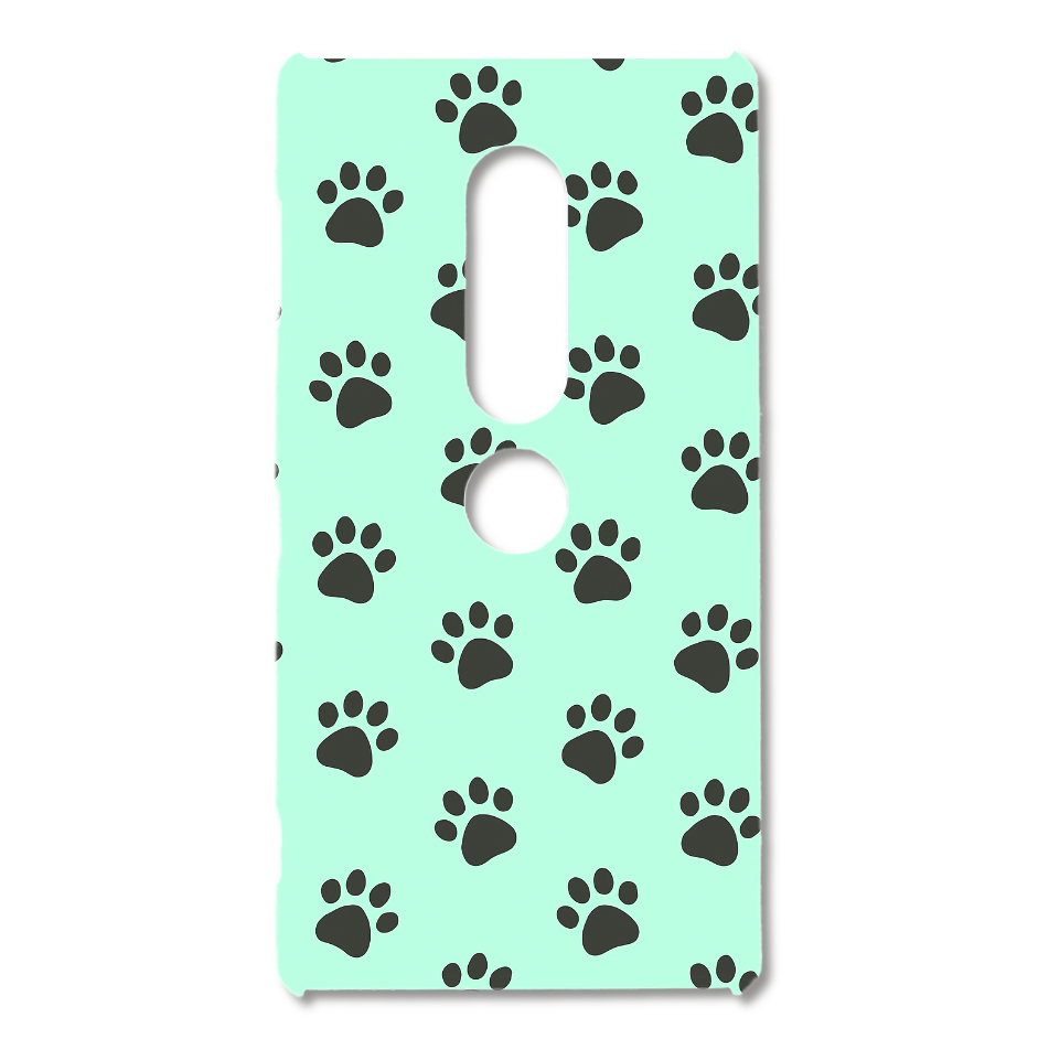 エメラルドグリーンの背景に黒い肉球模様を散りばめた、キュートで癒し感たっぷりのスマホケース。