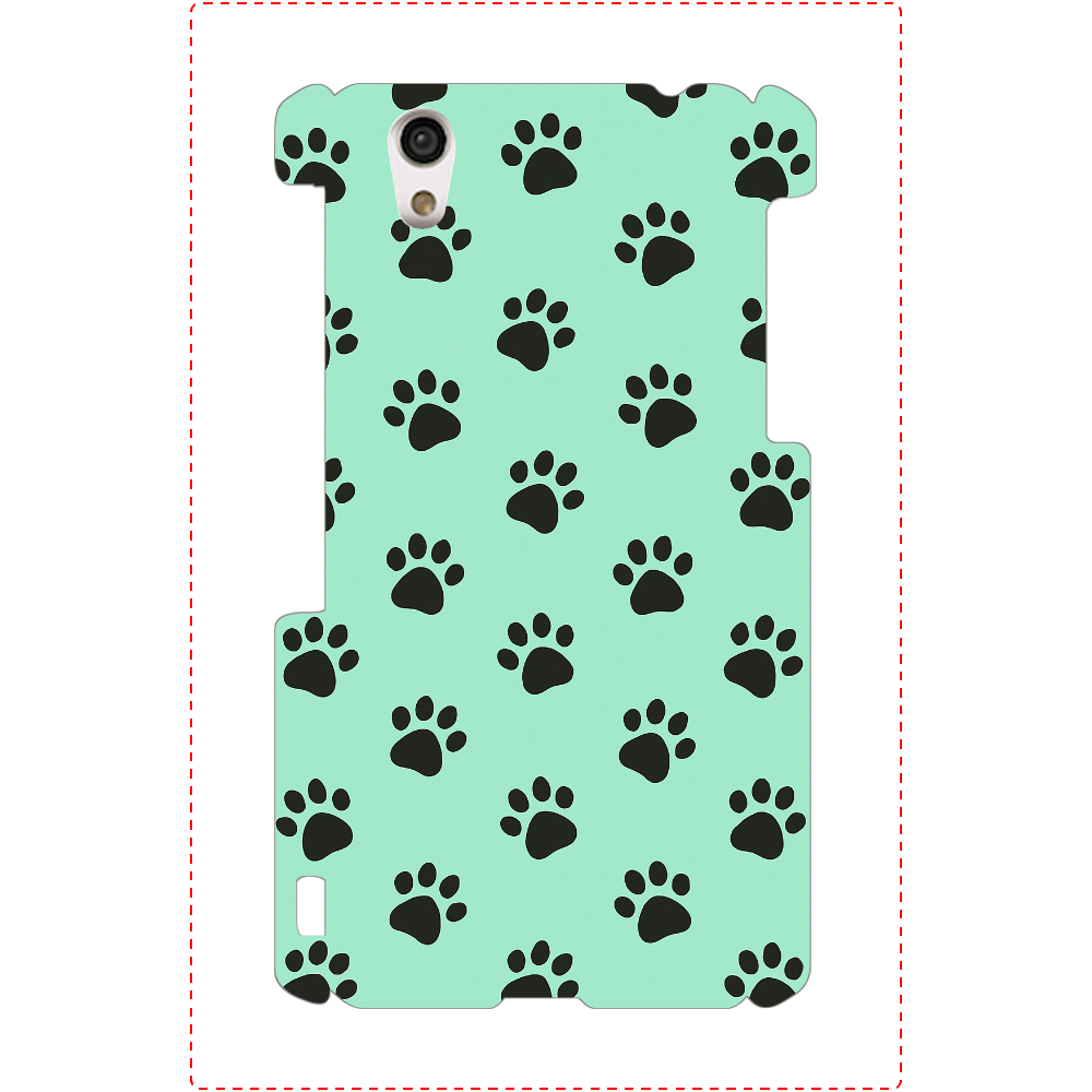 エメラルドグリーンの背景に黒い肉球模様を散りばめた、キュートで癒し感たっぷりのスマホケース。