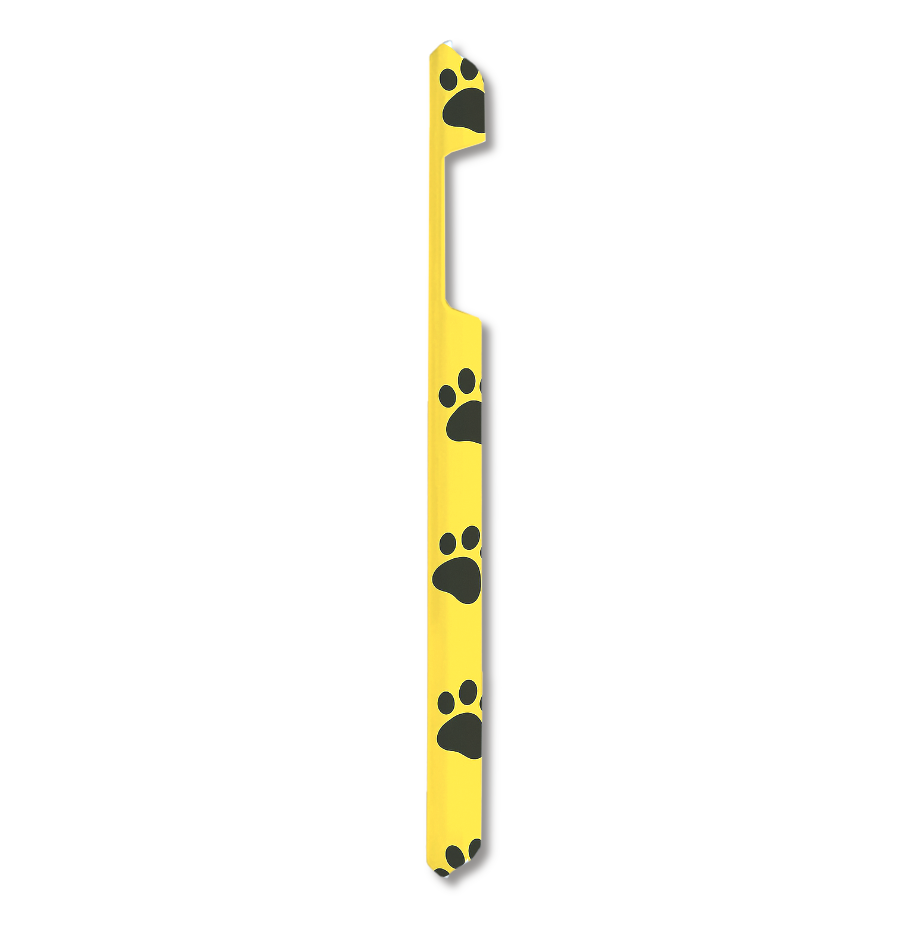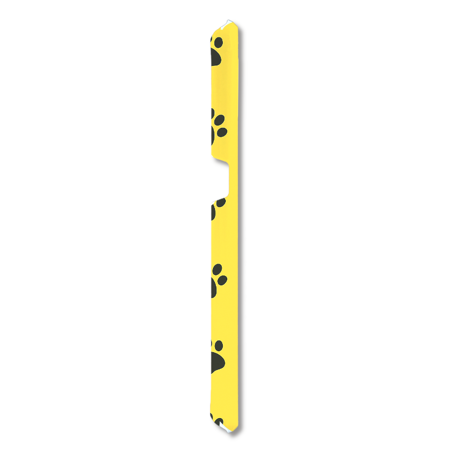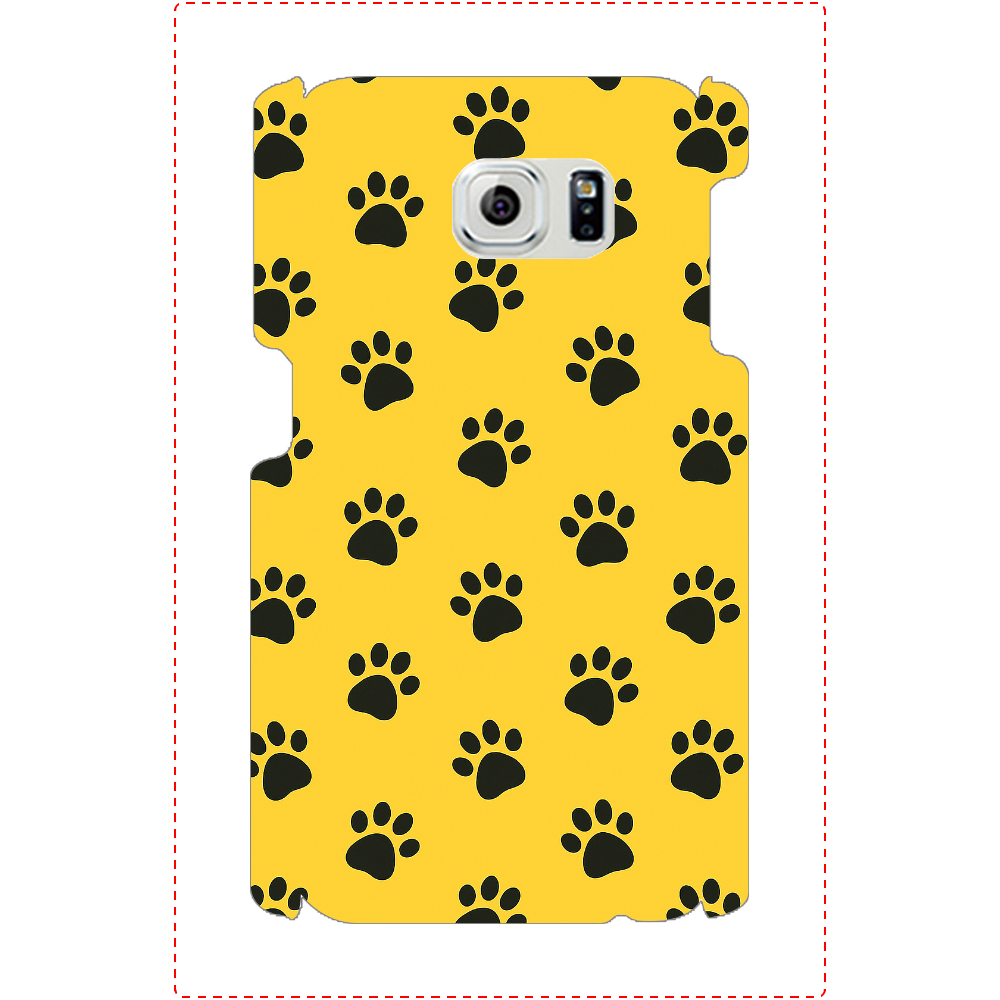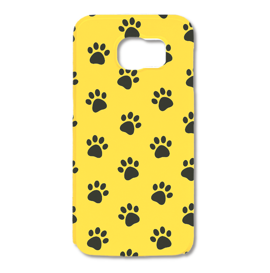 イエローの背景に黒い肉球模様を散りばめた、キュートで癒し感たっぷりのスマホケース。
