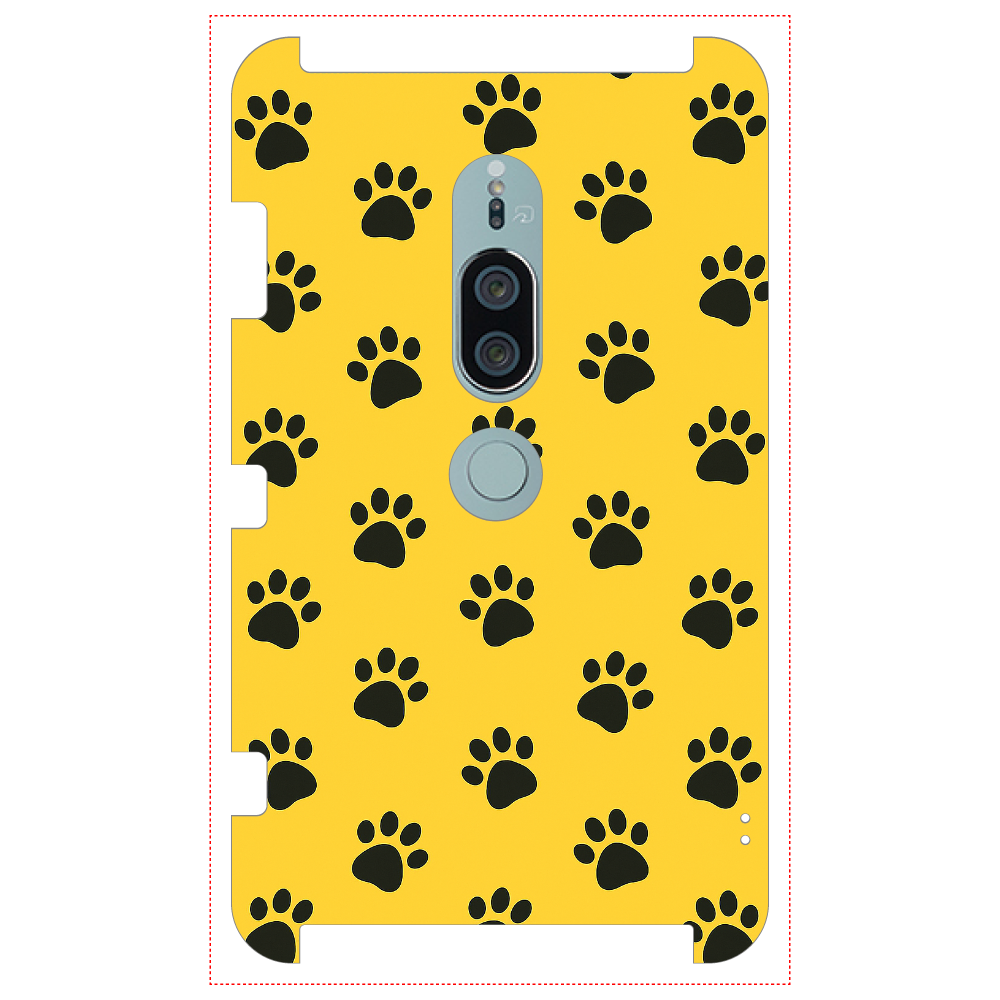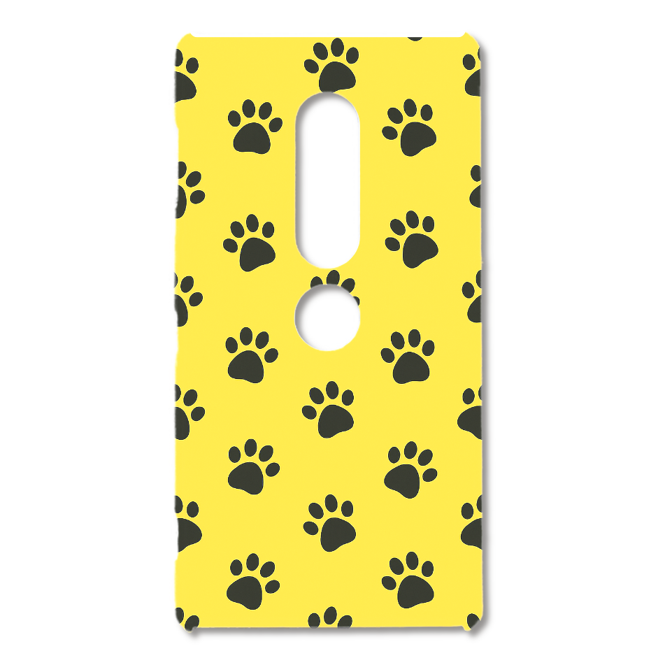 イエローの背景に黒い肉球模様を散りばめた、キュートで癒し感たっぷりのスマホケース。