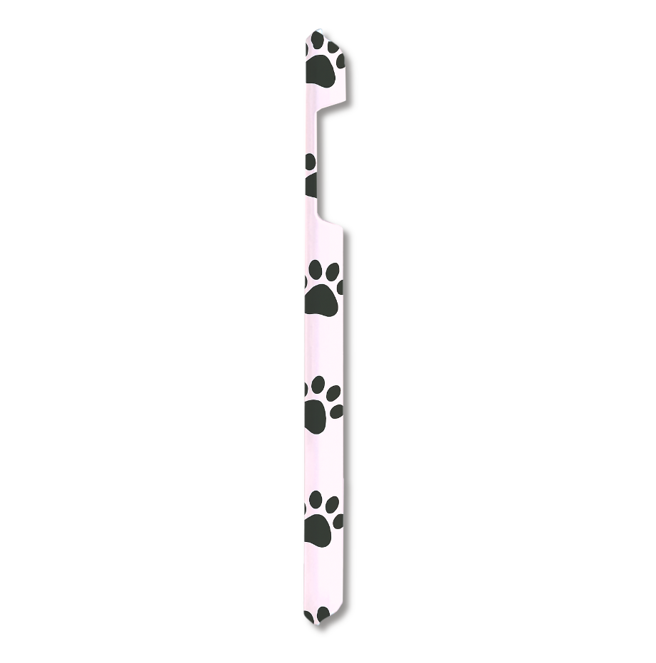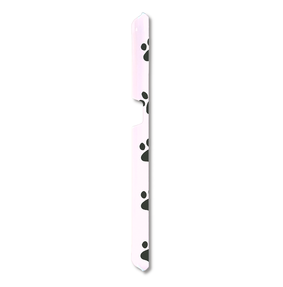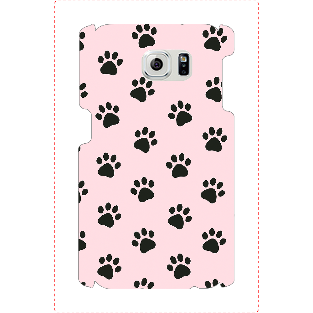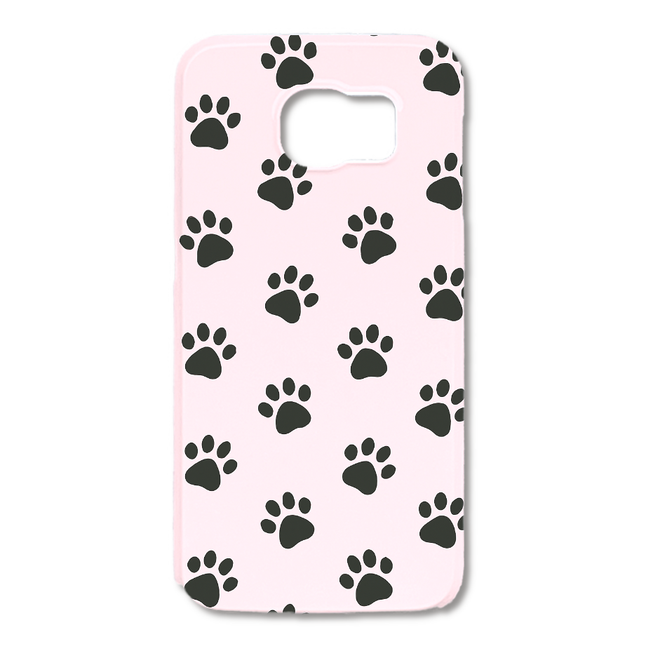 淡いピンクの背景に黒い肉球模様を散りばめた、キュートで癒し感たっぷりのスマホケース。