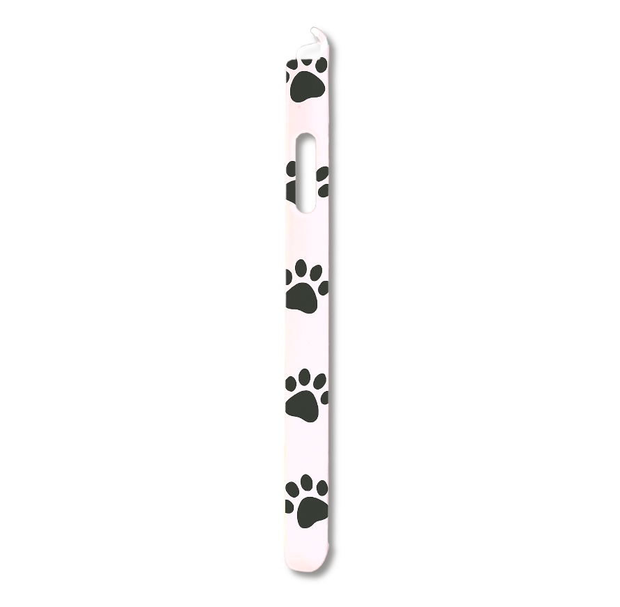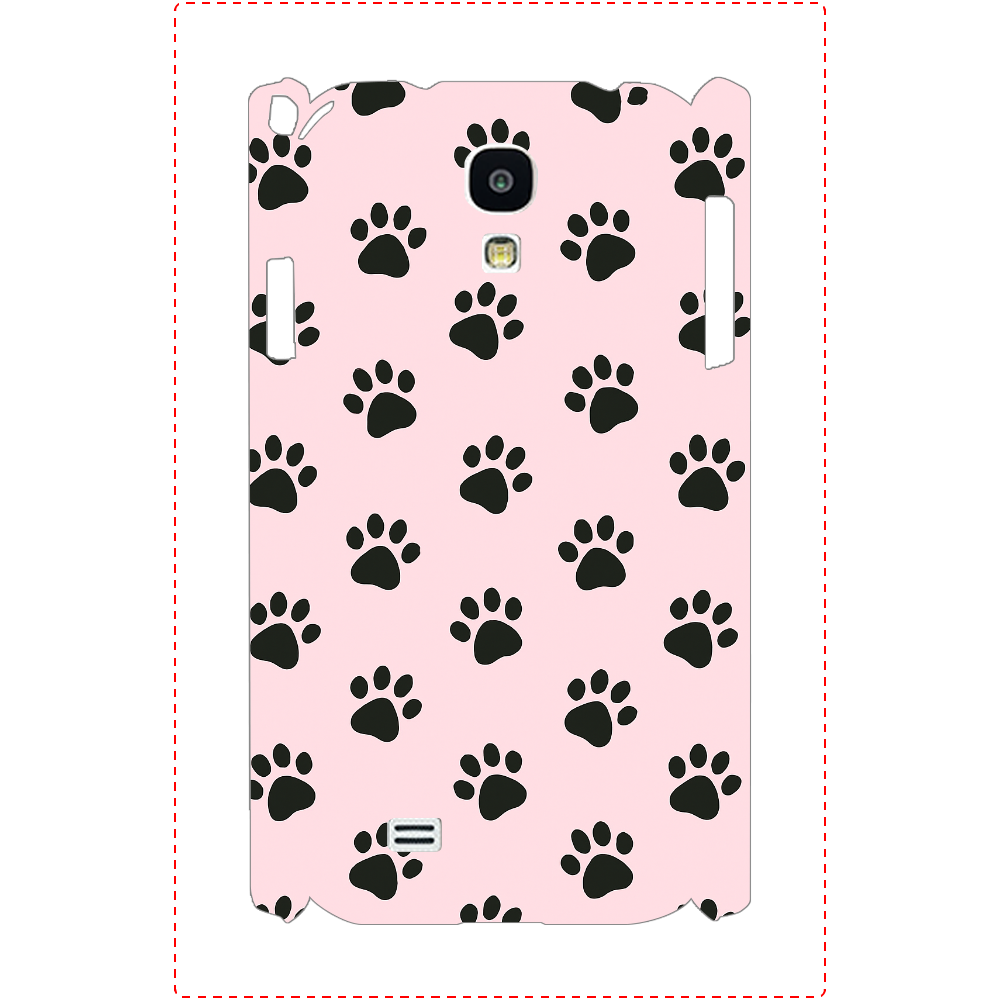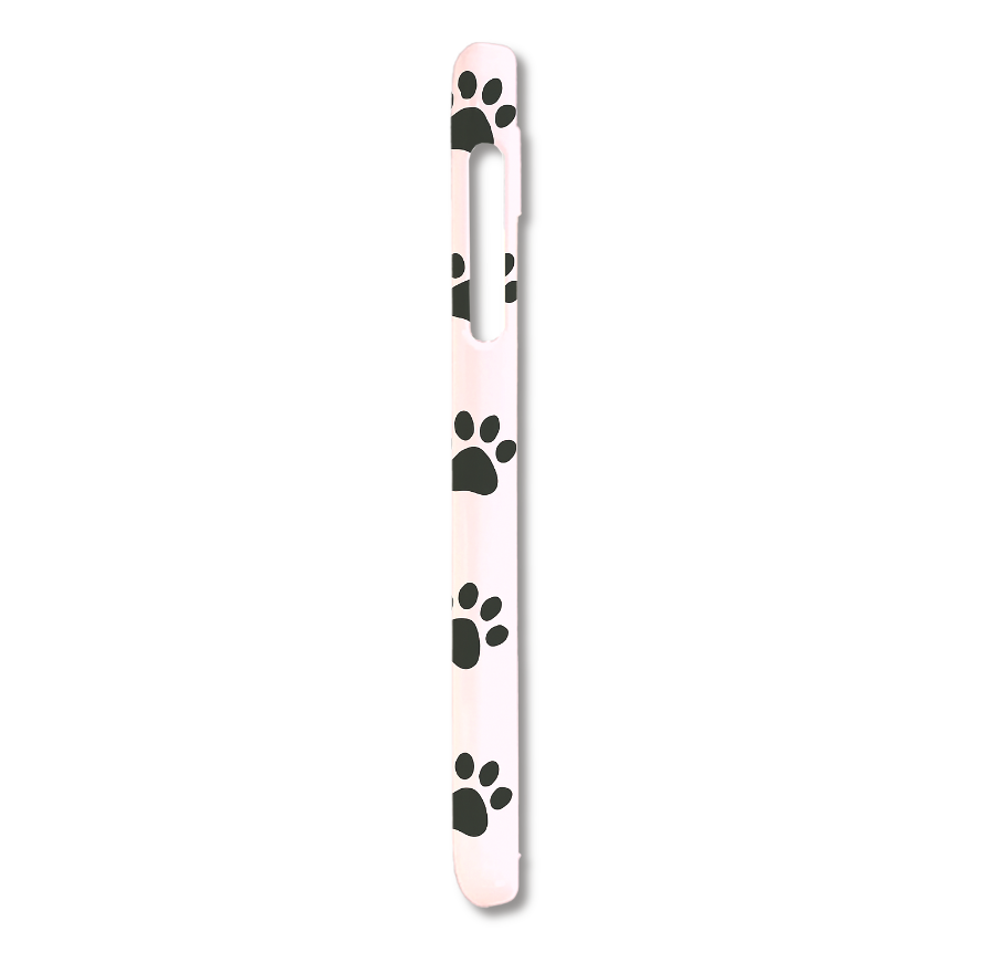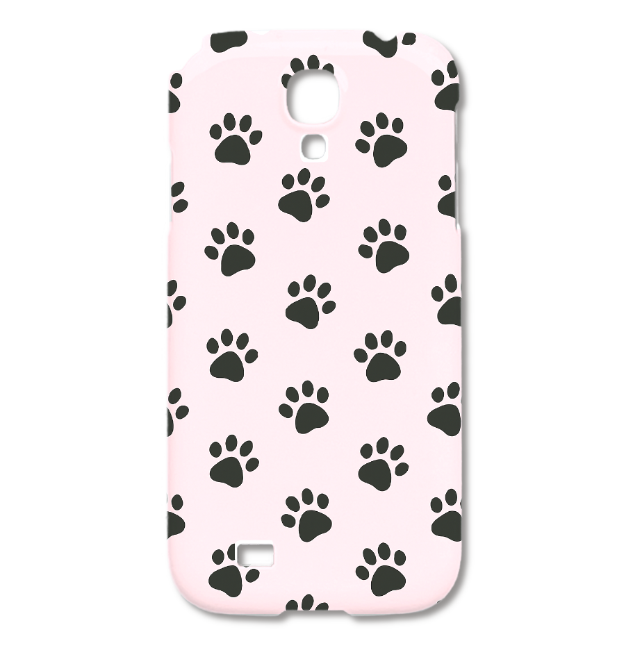 淡いピンクの背景に黒い肉球模様を散りばめた、キュートで癒し感たっぷりのスマホケース。