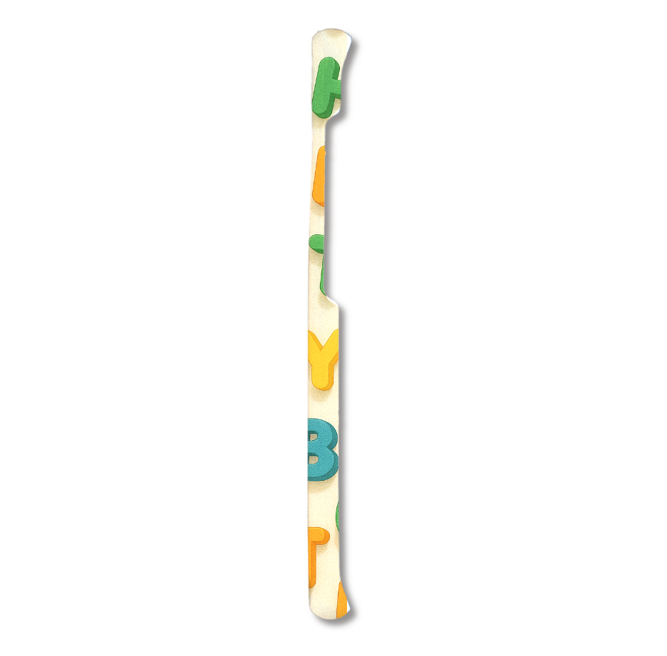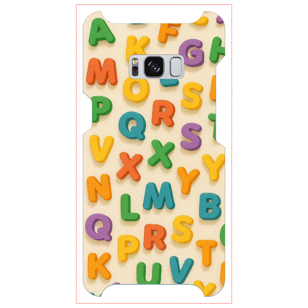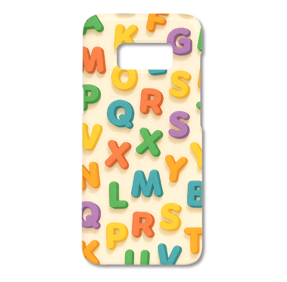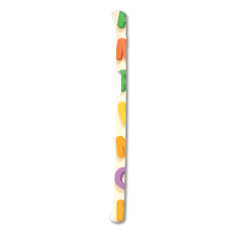 鮮やかな赤・青・緑・黄色・紫・オレンジで立体的に表現されたアルファベットが、ランダムに散りばめられたポップなデザイン。
