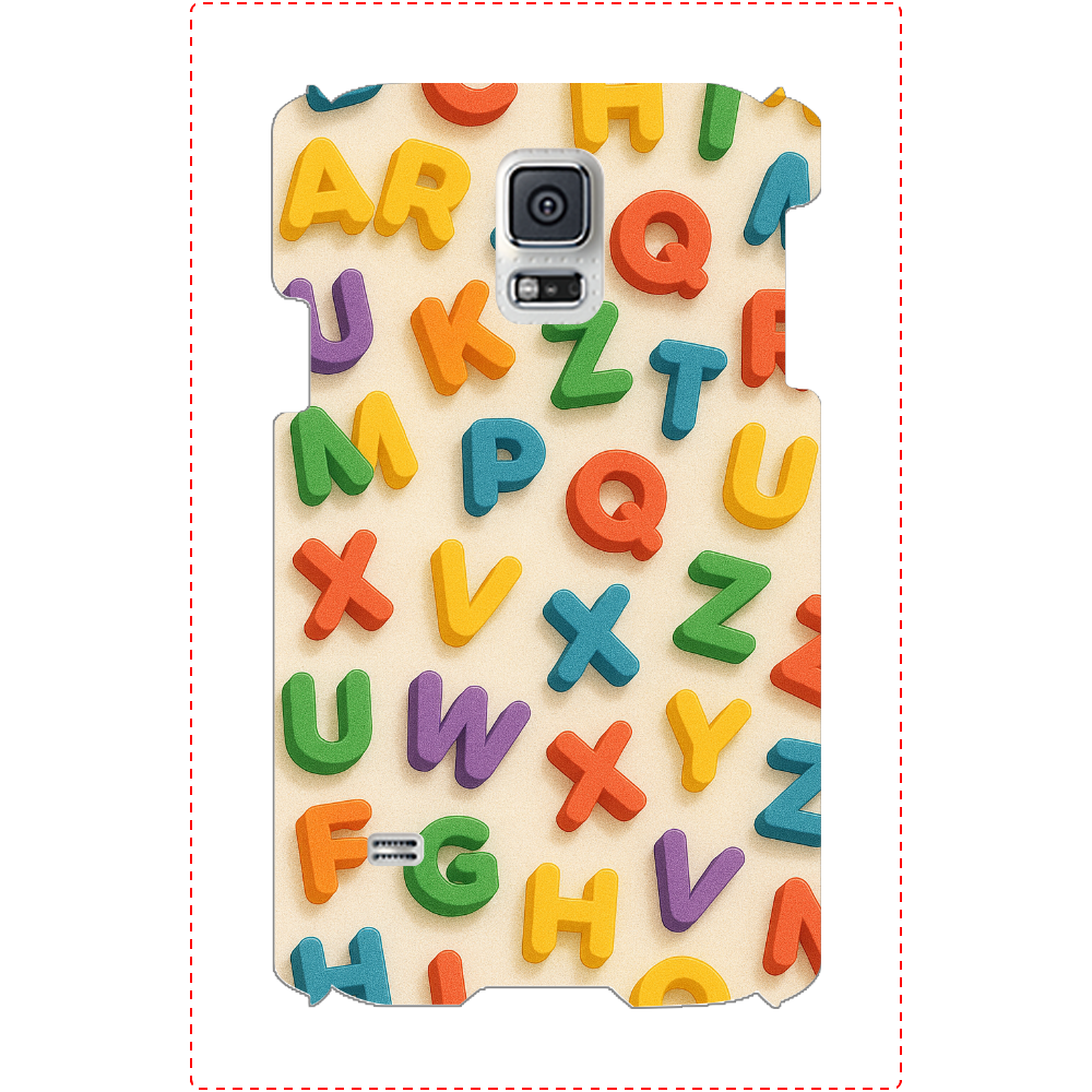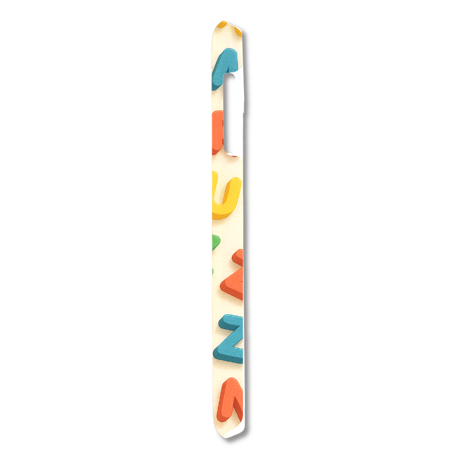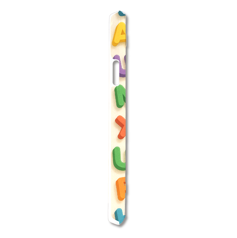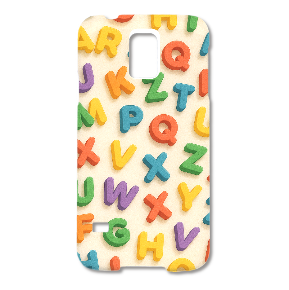 鮮やかな赤・青・緑・黄色・紫・オレンジで立体的に表現されたアルファベットが、ランダムに散りばめられたポップなデザイン。