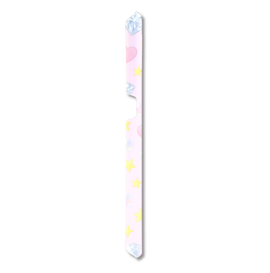 パステル背景に、ダイヤ・ハート・星・シャボン玉を散りばめた幻想的なデザイン。キラキラと輝くパターンは持つ人の気分を明るく彩ります。