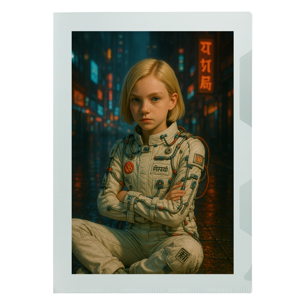 A young girl stares into the future with a cold gaze, standing against the backdrop of neon-lit streets. Her futuristic pilot suit creates a striking and powerful design.