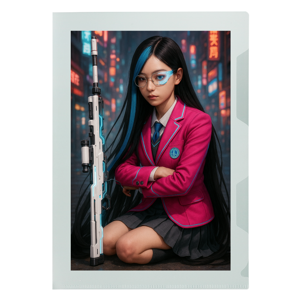 鮮やかな制服に身を包み、冷静な眼差しを向ける少女。近未来の街で光るライフルが存在感を放つ。