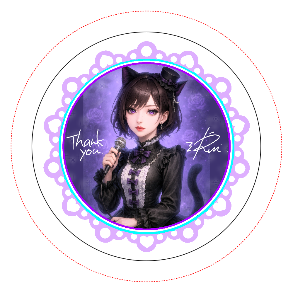 見出しの通り、色が途中で切れているのがどうしたものなのかと思いました。ちゃんと制作段階で◯に収まるように画像データを入れたから問題はないと思ったのに、、