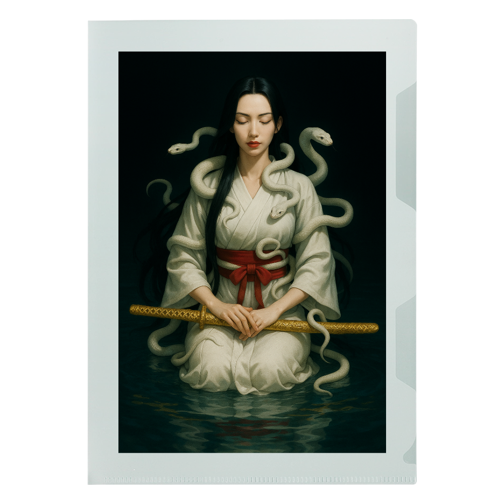 白装束に身を包み、蛇と共に静かに座す女性。黄金の刀が神秘的な力を感じさせる。