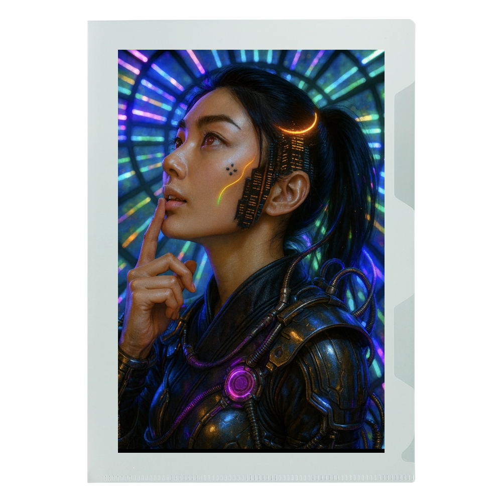 虹色の光を背に、未来を見つめるサイバー戦士。都市を映したような光の装飾が印象的。