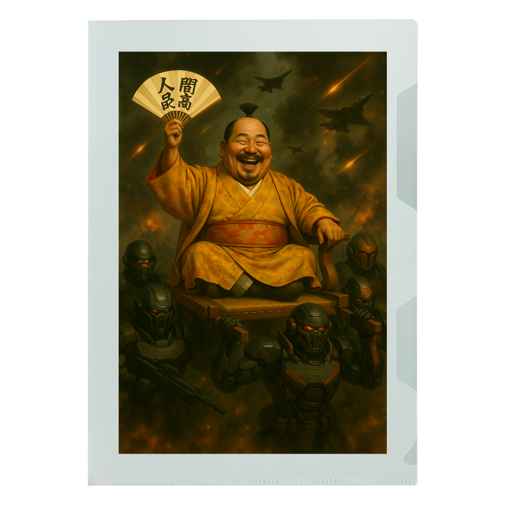 黄金の着物をまとった殿様が、屈強なロボット兵に担がれながら扇子を掲げる。背景には戦闘機が飛び交い、戦乱の中で「人間最強」を高らかに示す圧巻のビジュアル。