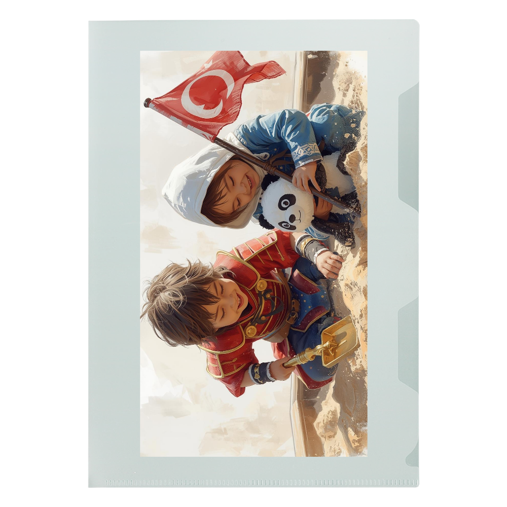 甲冑姿の少年とフードをかぶった少年が砂場で遊び、笑顔を交わす。傍らにはパンダのぬいぐるみと赤い旗。無邪気さと冒険心が同居する、心温まるワンシーン。