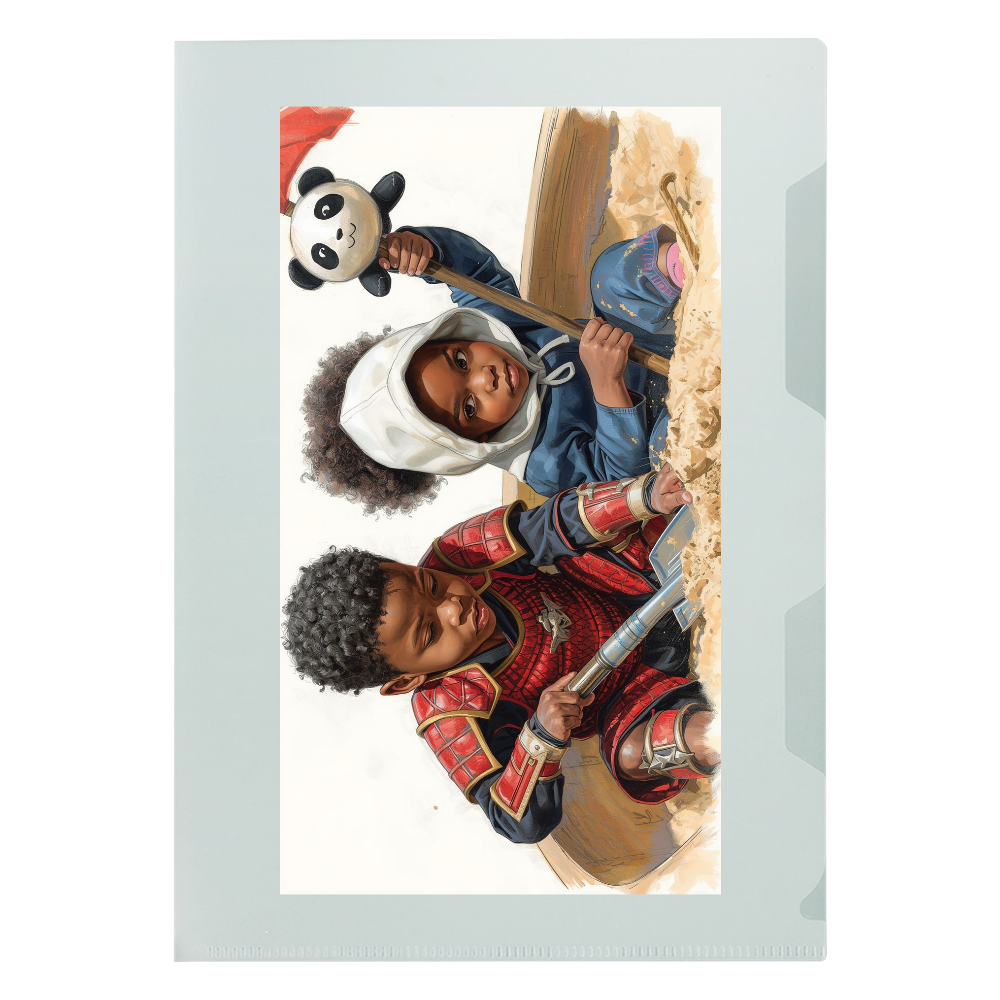 甲冑を身にまとった少年とフード姿の少女が砂場で夢中になって遊ぶ。小さな手にはスコップと旗、隣にはパンダのモチーフ。遊びの中に冒険心が光る瞬間。