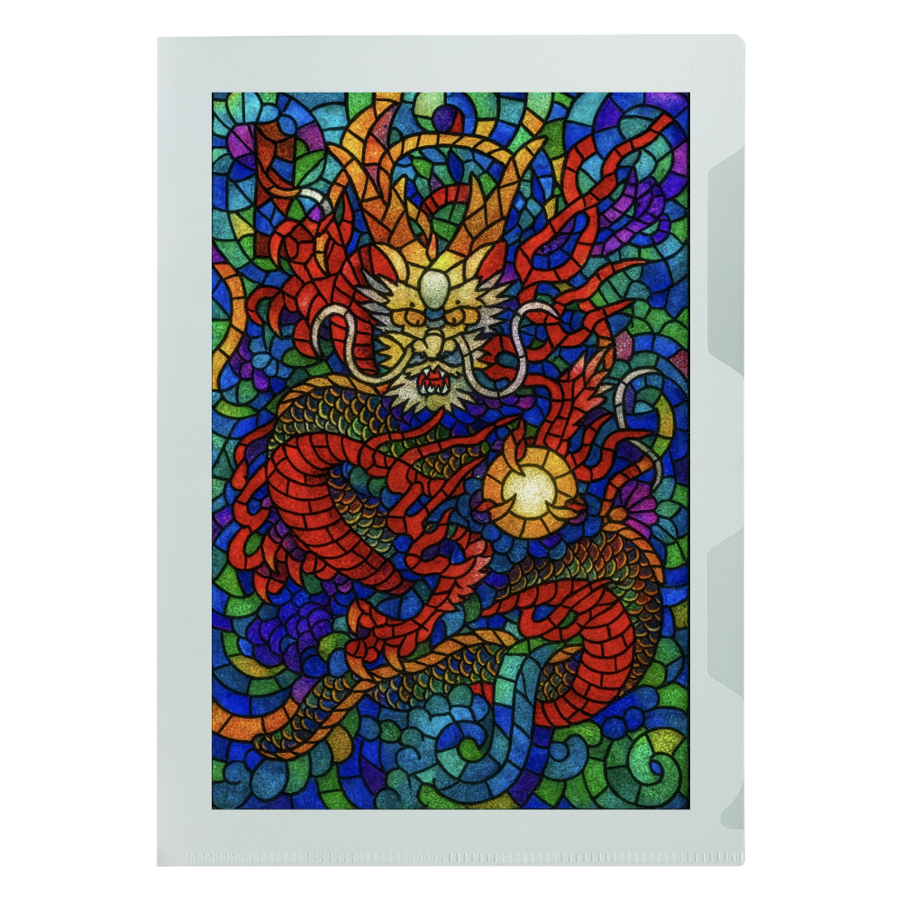 色鮮やかなステンドグラスに描かれた龍。神秘的な力を宿し、輝く珠を抱く姿が荘厳で力強い。