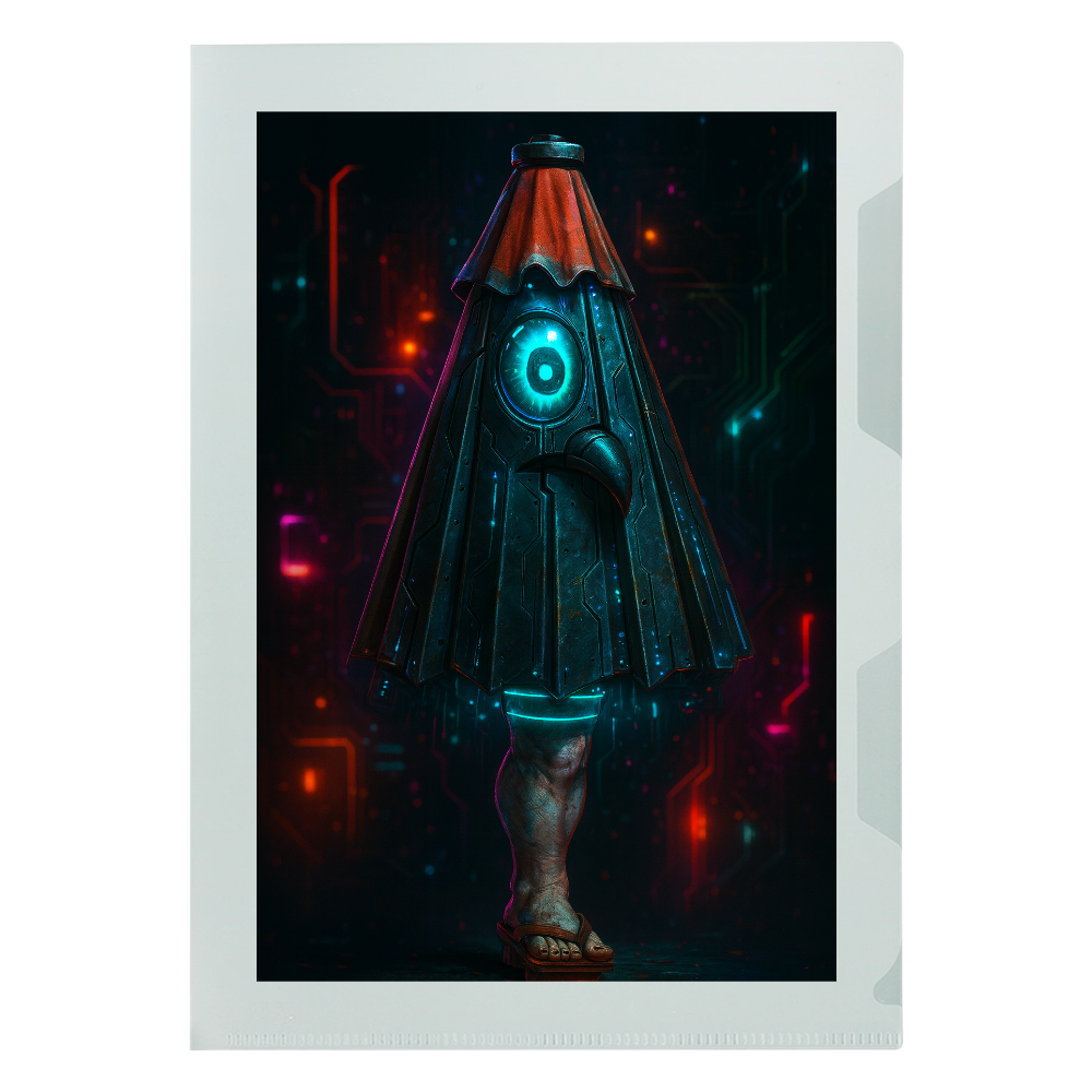 A reimagined version of the classic Japanese yokai "Karakasa Obake," transformed into a cyberpunk entity. With a glowing cybernetic eye and armored plating, it emanates an eerie yet futuristic presence.