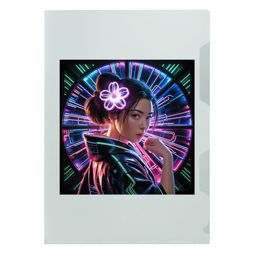 ネオンの光輪に浮かぶ、桜の髪飾りを纏った未来の姫。和とサイバーパンクが交錯し、静かな強さと美しさを放つ。