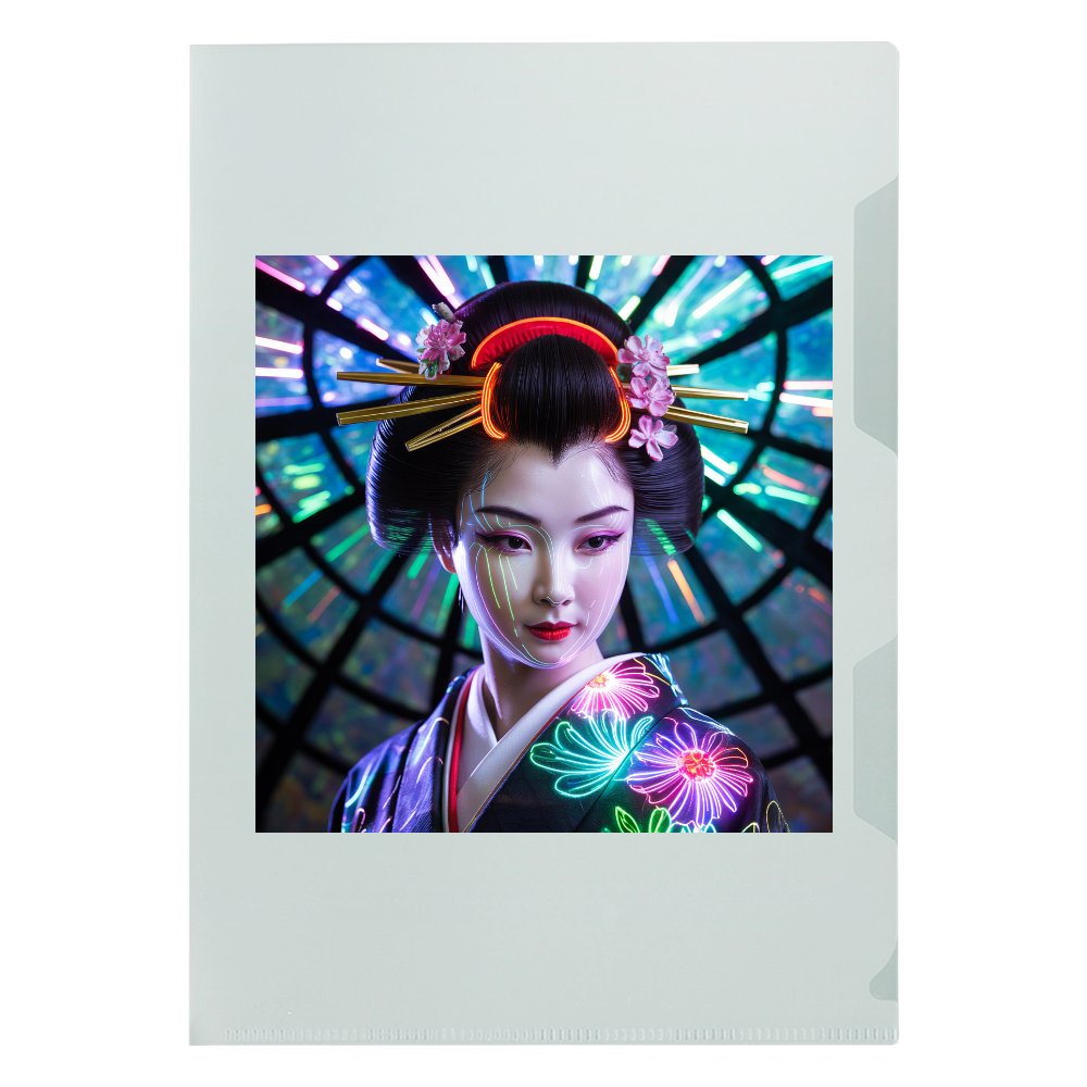 艶やかな和装に光り輝くネオン文様を纏い、電脳世界で舞う花魁。伝統美と未来技術が融合した幻想的な姿。