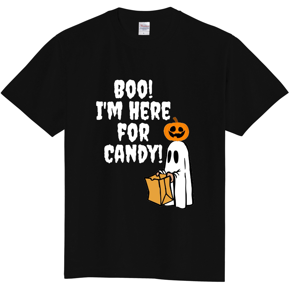 ハロウィンの仮装をしたお化けが「BOO!I’M HERE FOR CANDY!(お菓子をもらいに来たよ!)」と叫ぶ、可愛らしくポップなデザイン。パンプキンヘッドと紙袋がポイント!