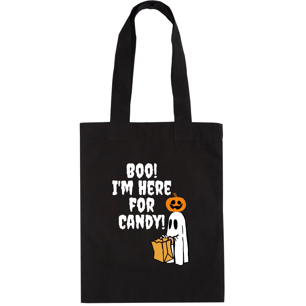 ハロウィンの仮装をしたお化けが「BOO! I'M HERE FOR CANDY!(お菓子をもらいに来たよ!)」と叫ぶ、可愛らしくポップなデザイン。パンプキンヘッドと紙袋がポイント