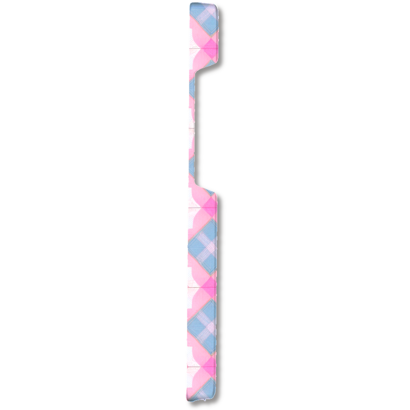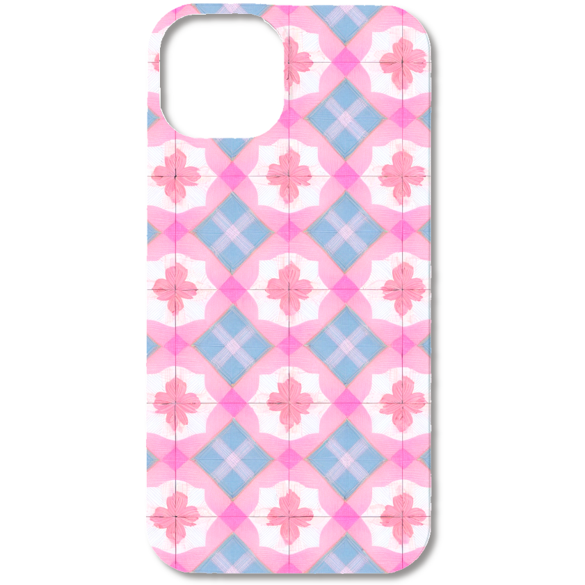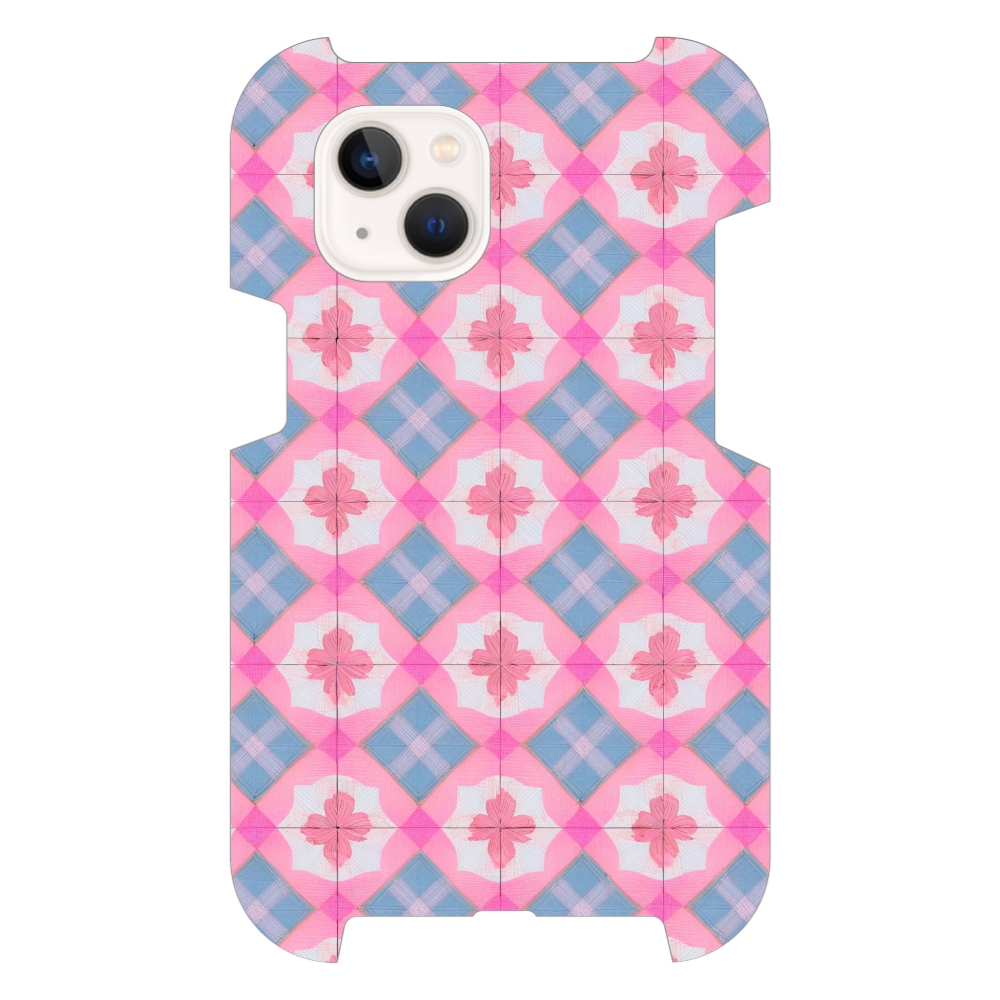 このスマホケースは、エキゾチックなモロッカンタイルを思わせる、幾何学模様と花模様が織りなすデザインです。柔らかなパステルピンクと落ち着いたパステルブルーの組み合わせが、甘すぎず上品な雰囲気を演出します。手描きの線や、ざらりとしたテクスチャ感が、デジタルにはない温かみとクラフト感を加えています
